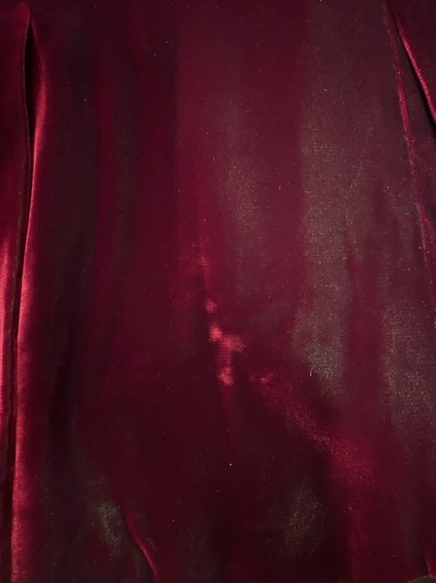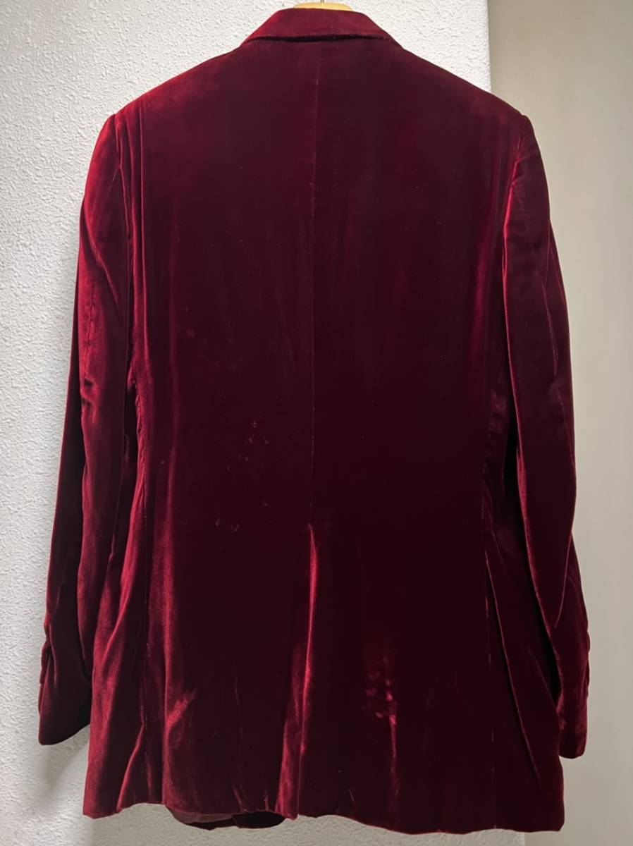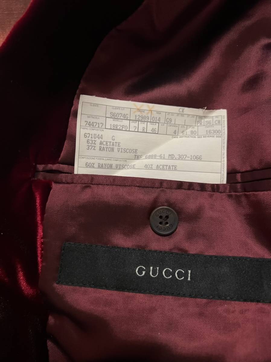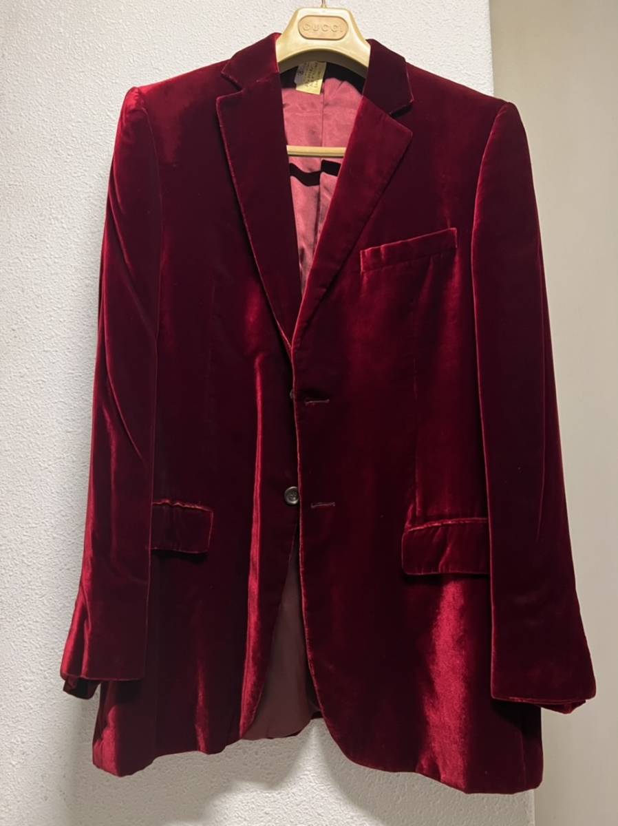 GUCCI グッチ    ベロア ジャケット      中古です。     色  赤  レッド      サイズ46        スイス製          素材 ★ベロア素材 画像をご参照ください。         寸法  ジャケット、肩幅、約44.5cm、脇下身幅、約53cm、袖丈、約64cm、着丈、約76cm               素人採寸のため誤差はご容赦願います。            クリーニング時に 第一ボタンと襟の接触部分のアイロンのあて方が若干ずれてしまっているように感じられします。  光の当たりかたにより、背中の左中央部と右裾付近に数か所生地が寝てしまっている部分が見受けられます。着用時それほど目立つものではありませんが何卒ご了承願います。                             付属品はありません、         ゆうパック送料着払いで発送いたします。