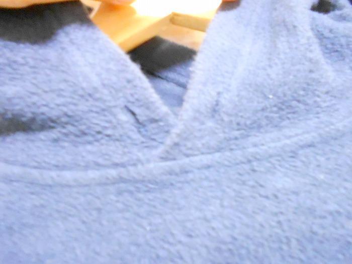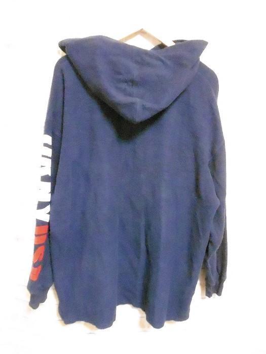 色は黒。 全体的に色落ち、フード紐部分紛失、左袖プリントにやや粘着があります。