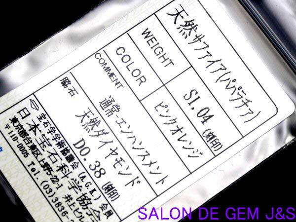 【中石素材】:高級天然パパラチァサファイア(1.04ct)刻印あり
