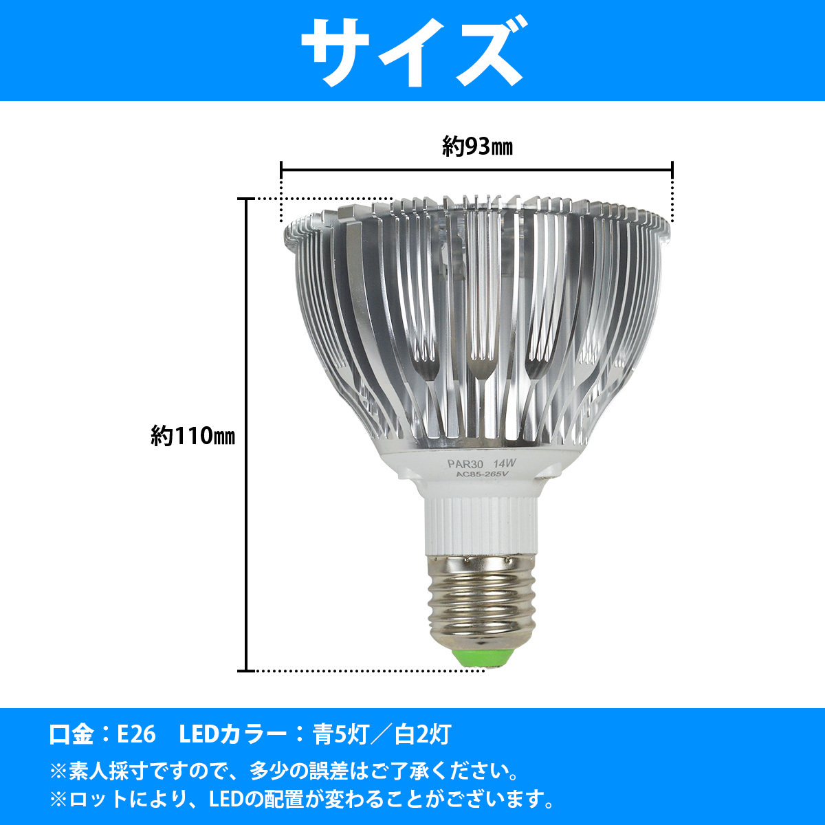 水槽 用 スポット ライト 電球 7LED 14W 青5/白2灯 口金 E26 アクアリウム 電球 照明 植物育成 水草 サンゴ 熱帯魚 観賞魚