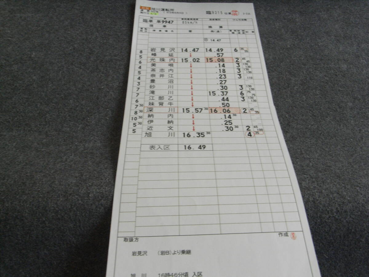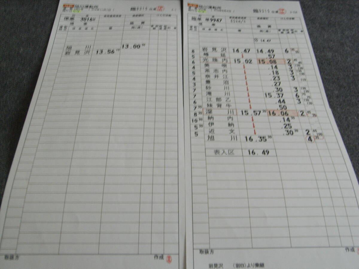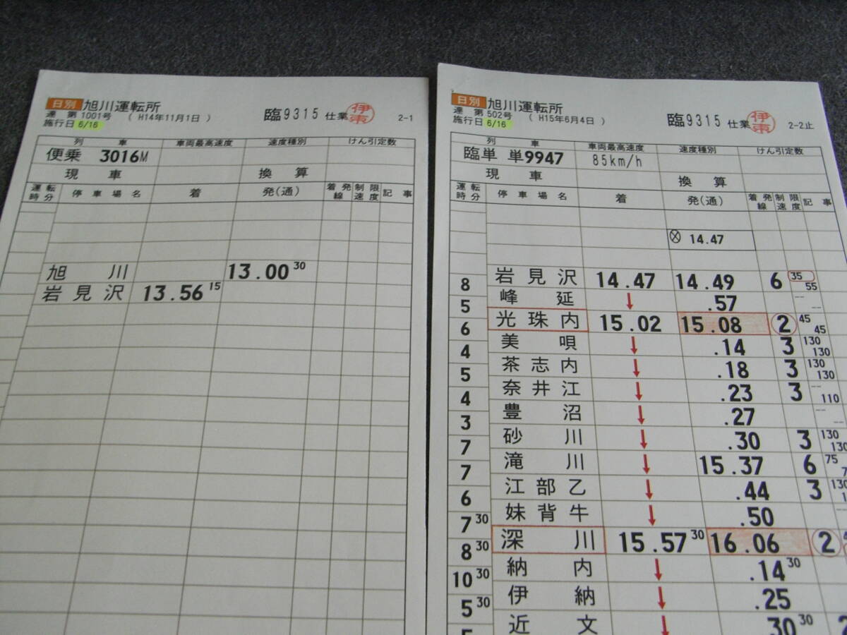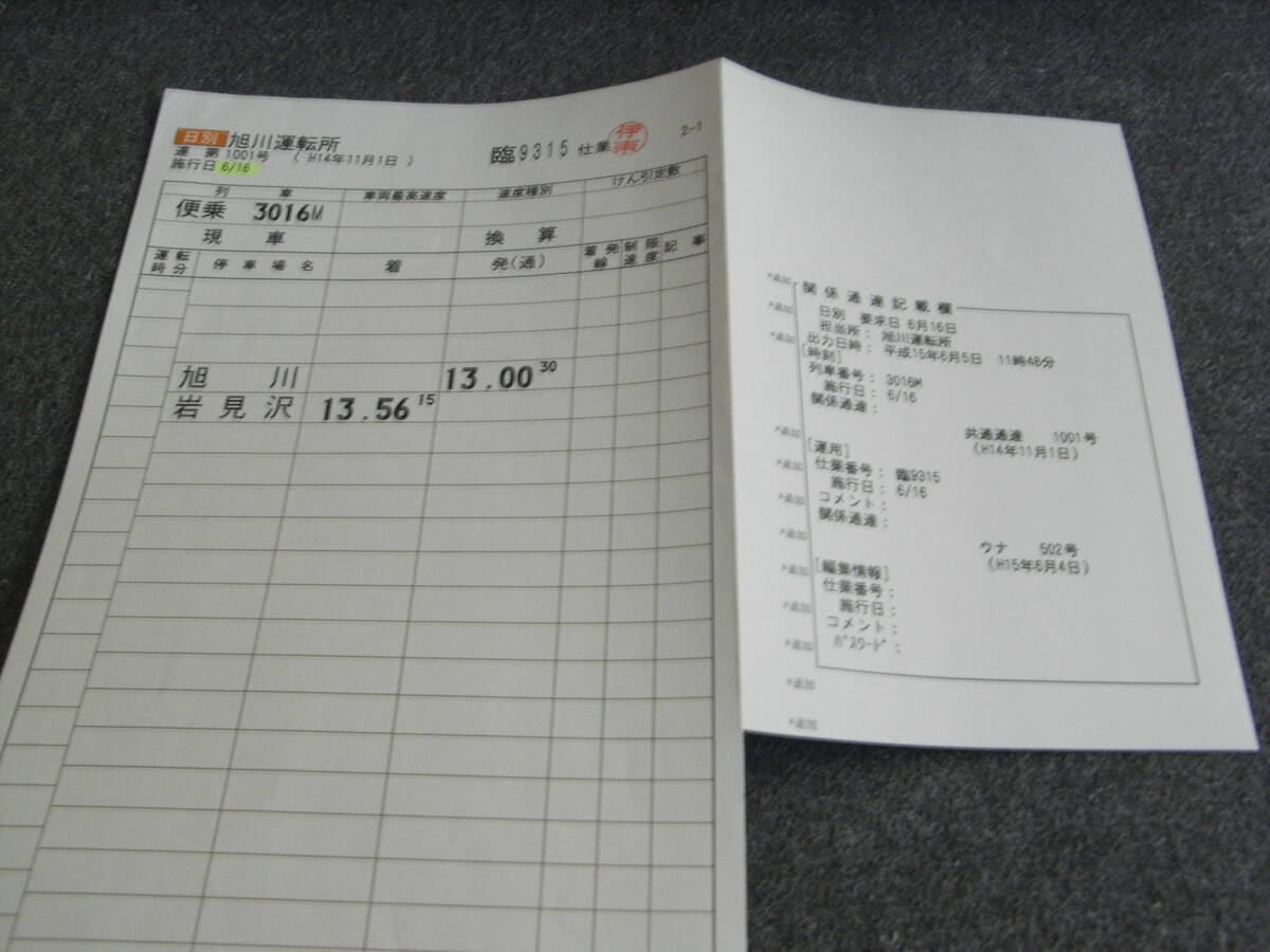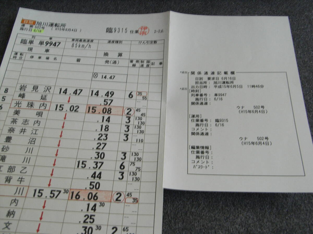 2枚/スタフ 函館本線 旭川運転所 臨9315仕業 臨単 単9947 岩見沢-旭川/便乗3016M 旭川-岩見沢 施行日 平成15年6月16日●運転士時刻表