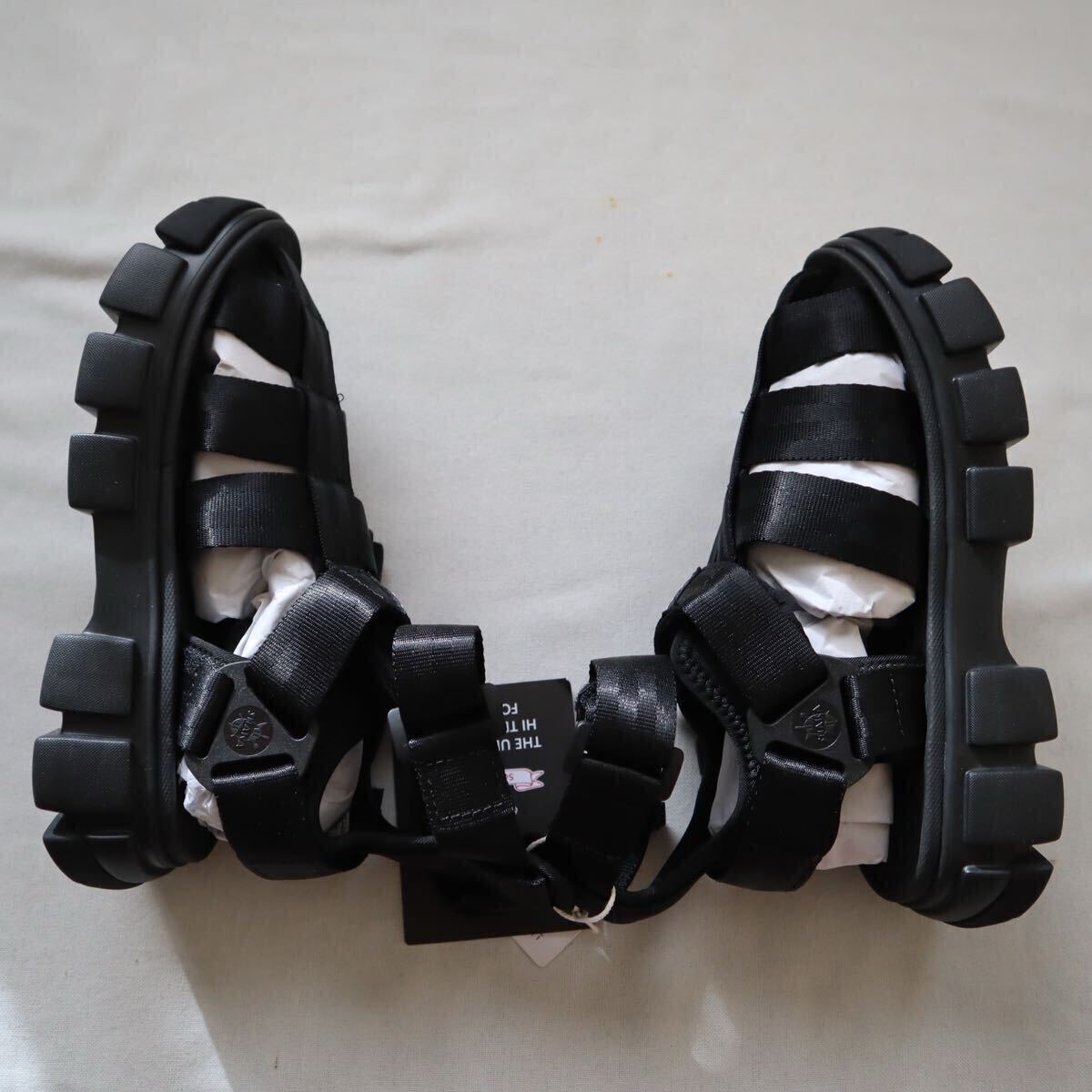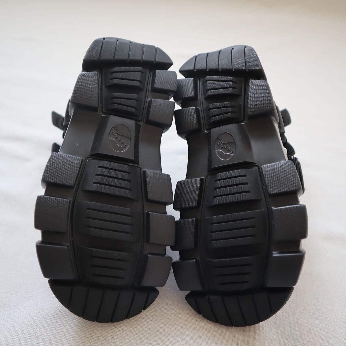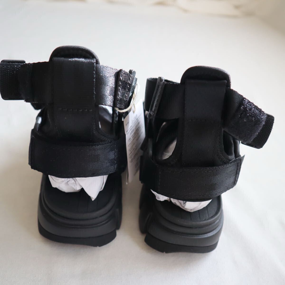 足首までホールドされたストラップと誇張したブロックパターンのソールがラグジュアリーでモードな印象のアイテムです。