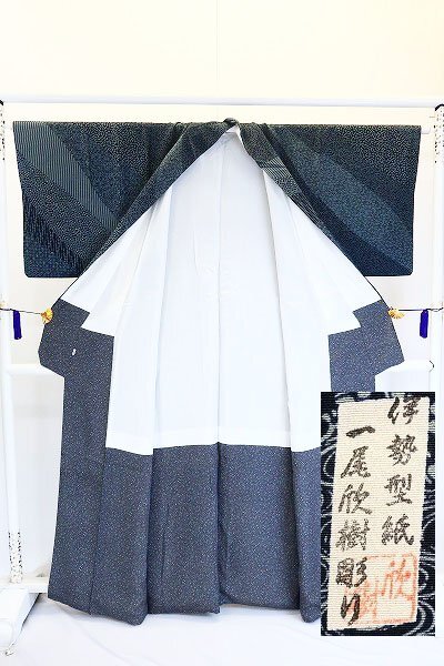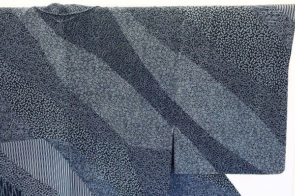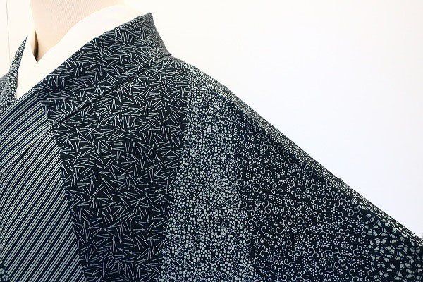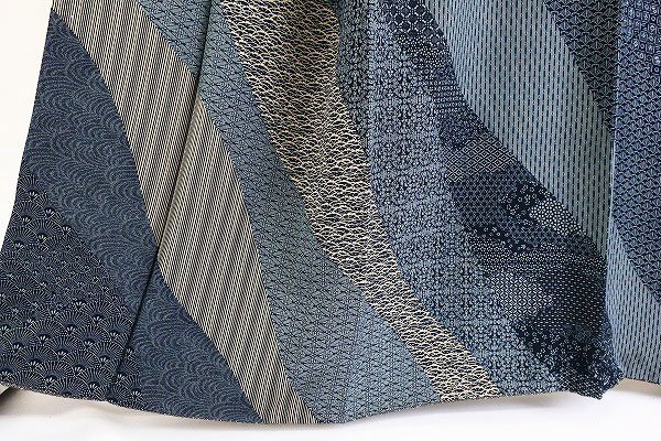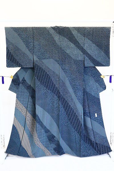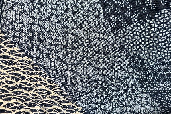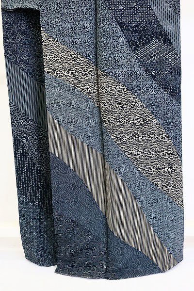 濃藍色の絹地に、柄が割付されております。 花紋やストライプ等の様々な柄がお洒落な一枚です。 未使用品です。 担当:前田 |