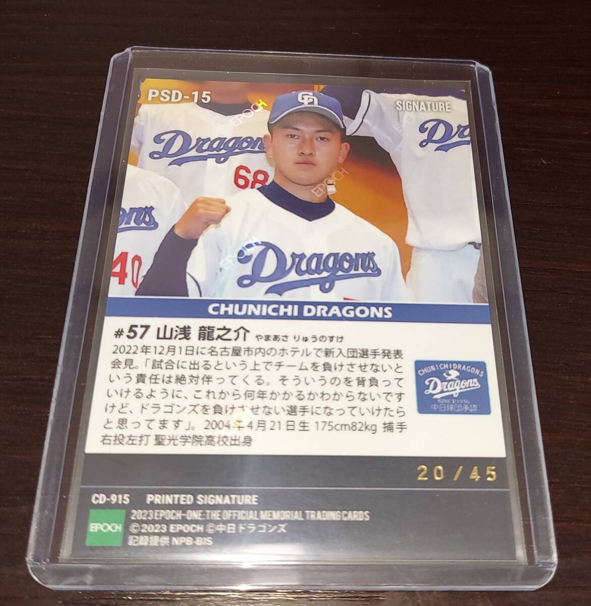 2023EPOCH one山浅龍之介45枚限定プリントサインシリアルナンバールーキーカード 中日ドラゴンズ 新入団発表