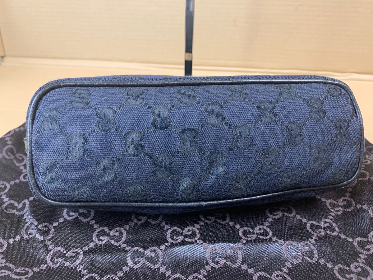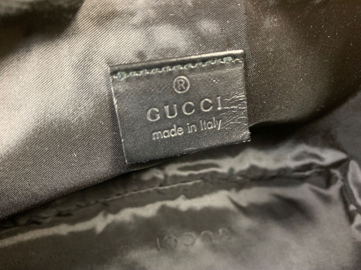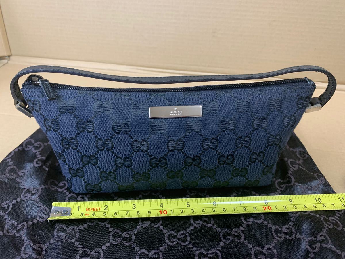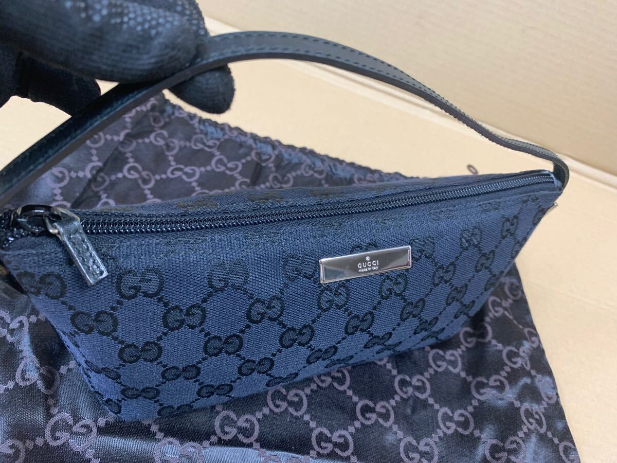 中古GUCCIのミニバッグの出品です。グッチのアクセサリーポーチ黒のGG柄キャンバス×レザー素材になります。サイズは写真でご確認できます。Made in Italy、イタリア製です。