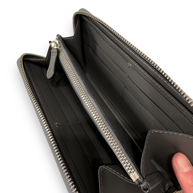 色は濃淡のあるグレーで、クロコ型押しが施されたレザー、内部はカードスロット、小銭入れ(中央)などがあります。(画像をご参考ください。)