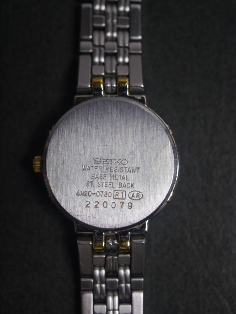 裏蓋にWATER RESISTANT/BASE METAL/ST.STEEL BACKの刻印があります。