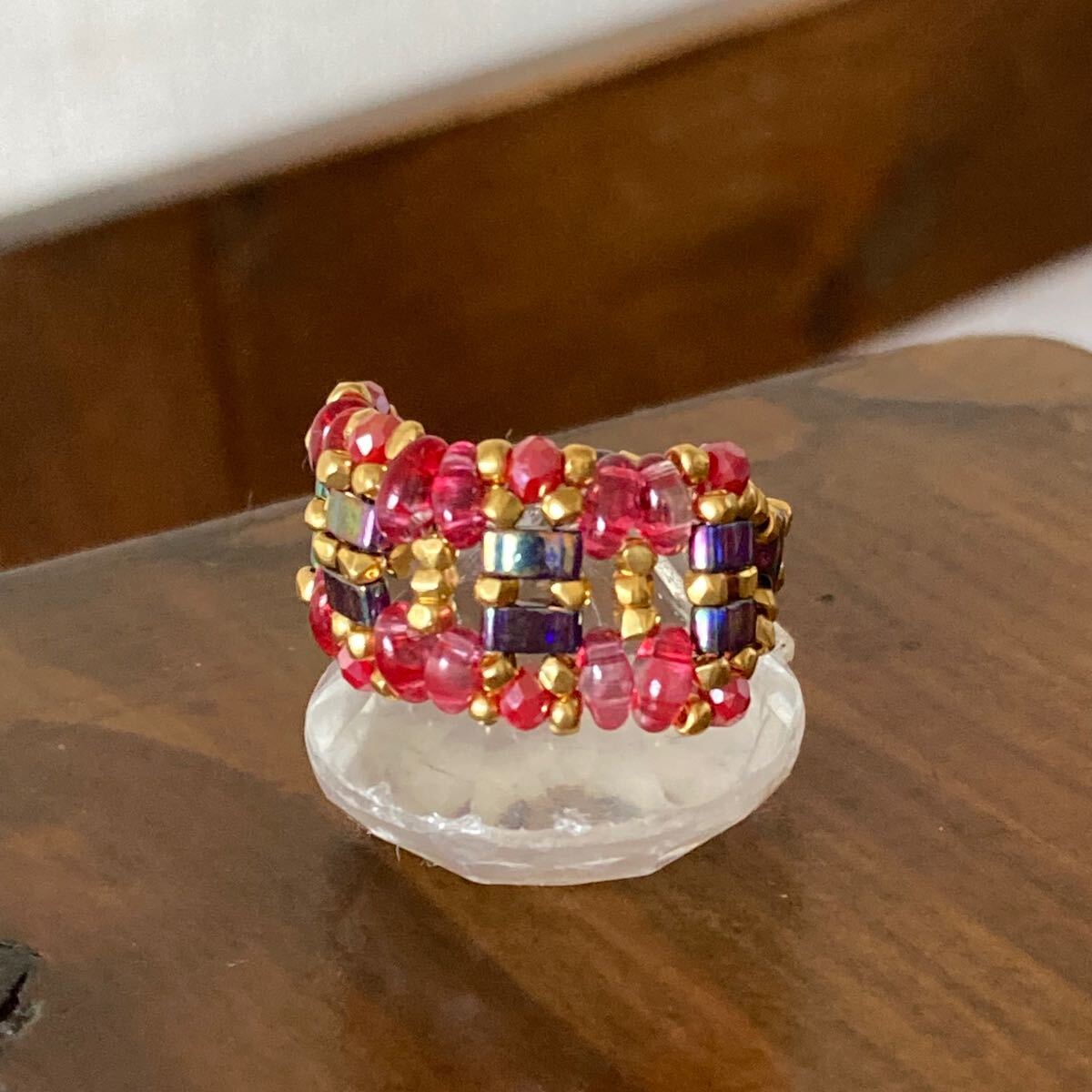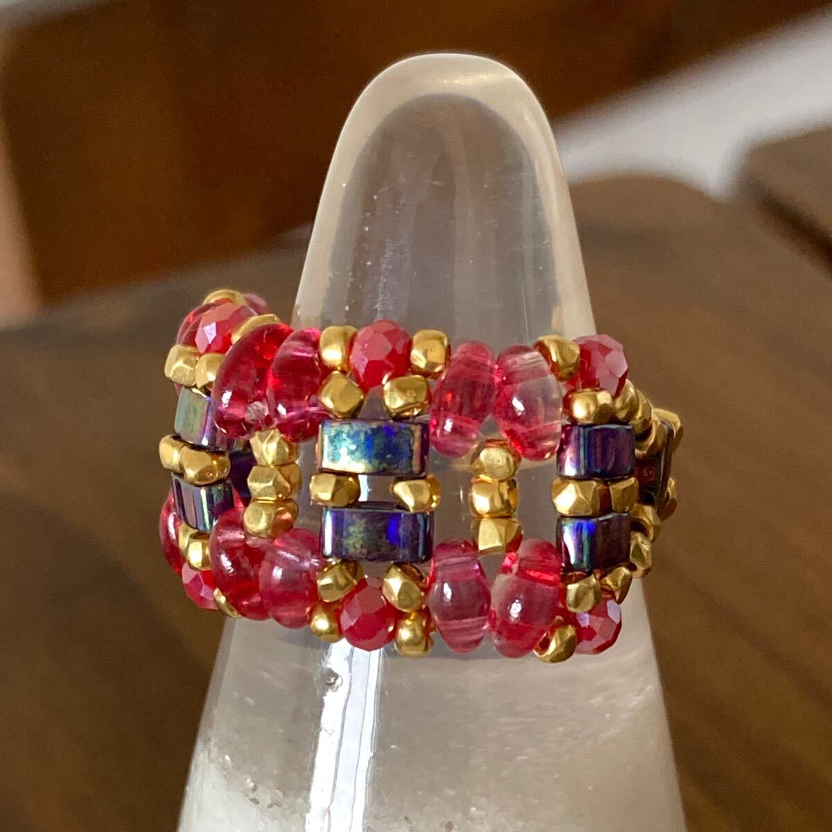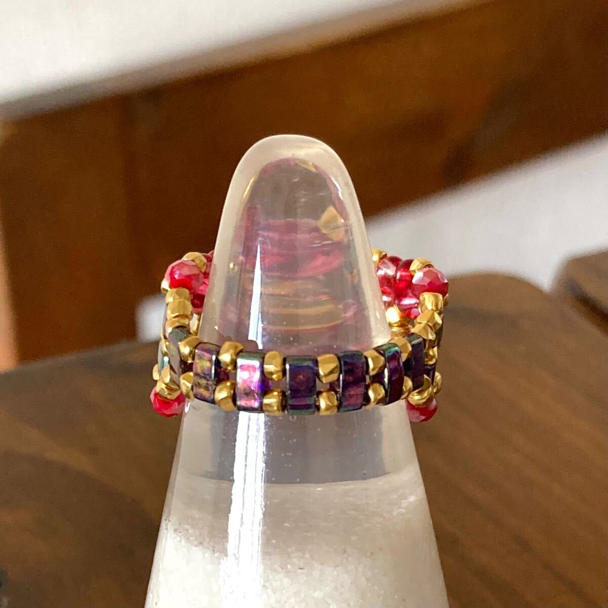 5mmの玉虫系パープルのハーフティラビーズ、クリアレッドのツインビーズ、赤のミニボタンカットビーズ、ゴールドのスリーカットビーズで作ったリングです。
