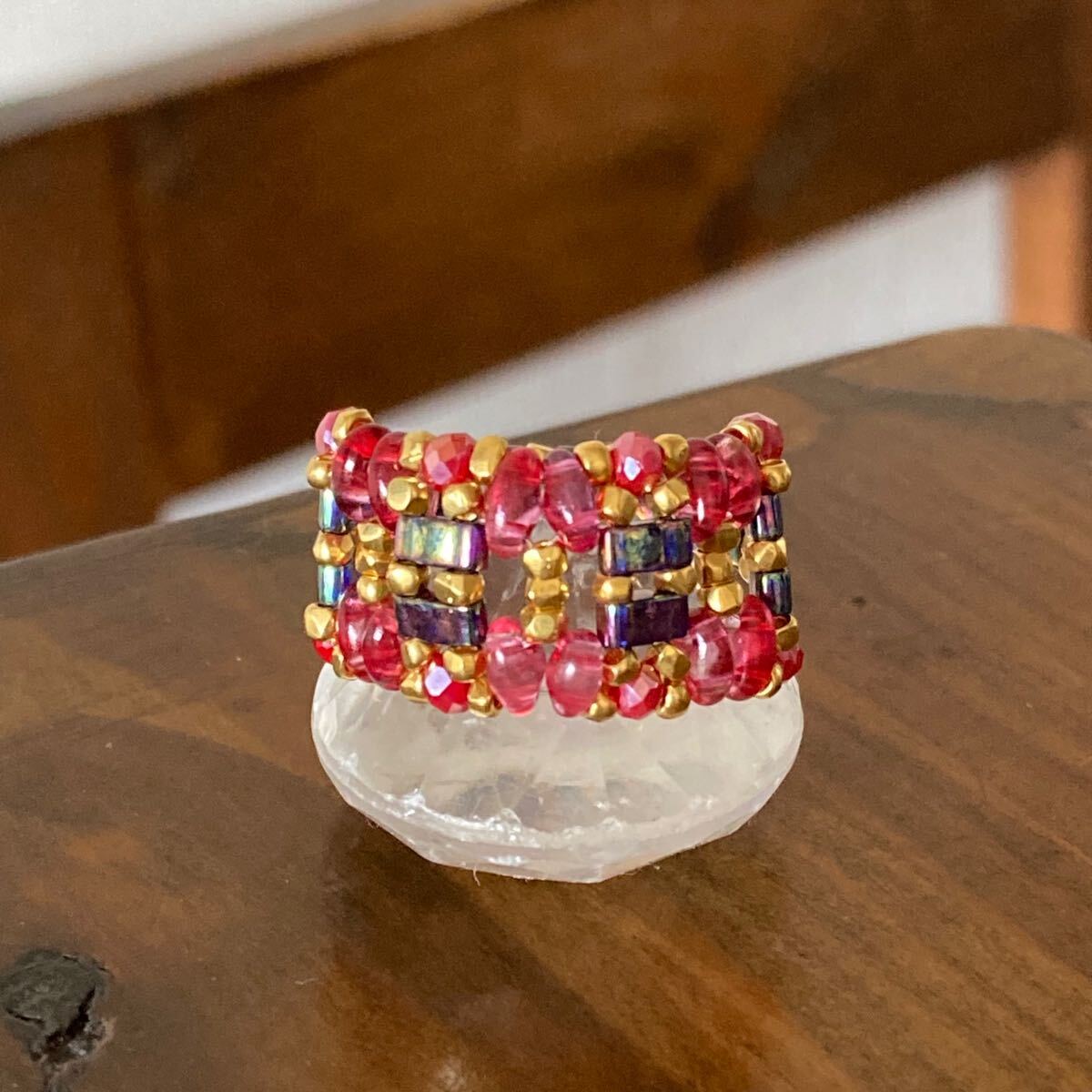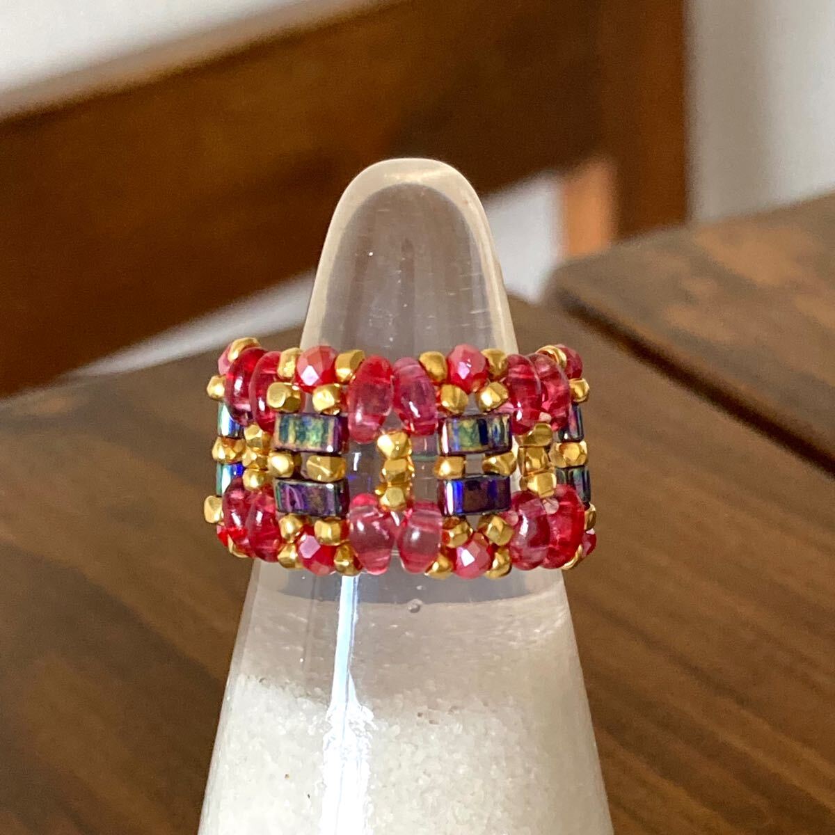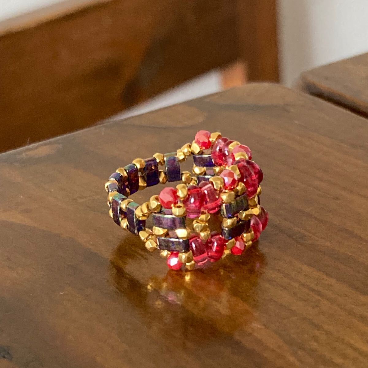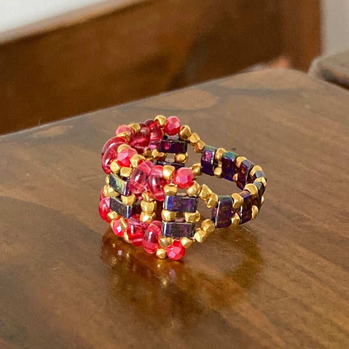 5mmの玉虫系パープルのハーフティラビーズ、クリアレッドのツインビーズ、赤のミニボタンカットビーズ、ゴールドのスリーカットビーズで作ったリングです。