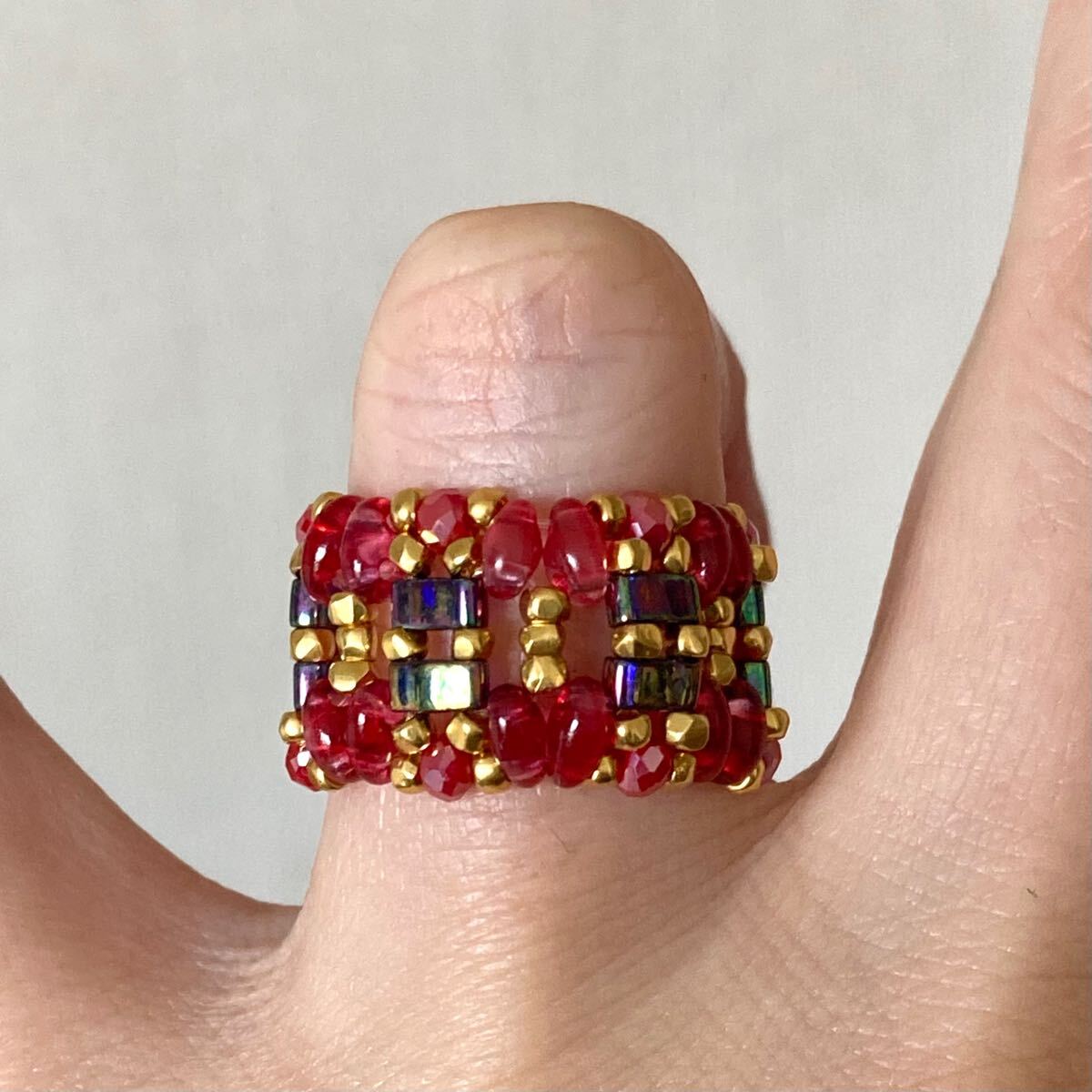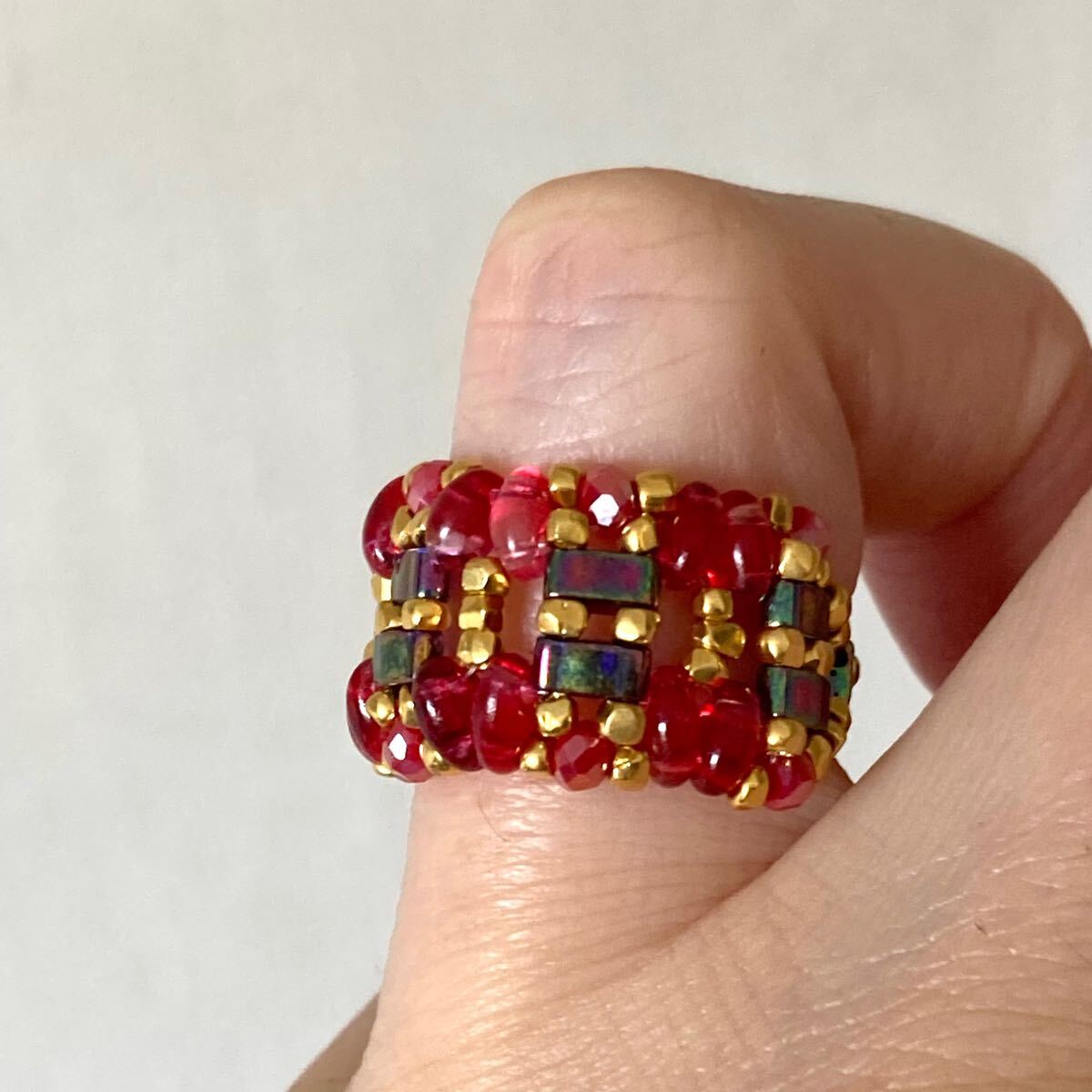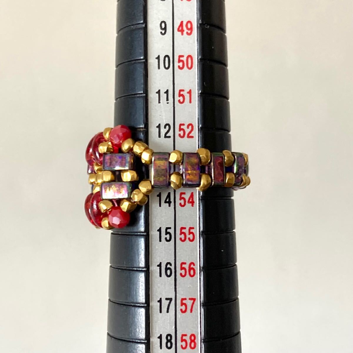 12-14号 ハーフティラビーズとツインビーズのリング 赤×ゴールド