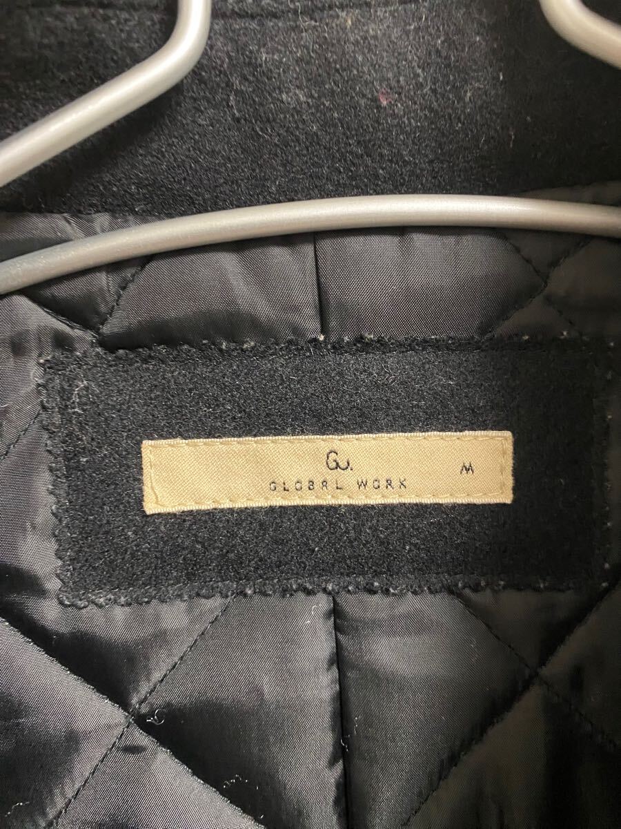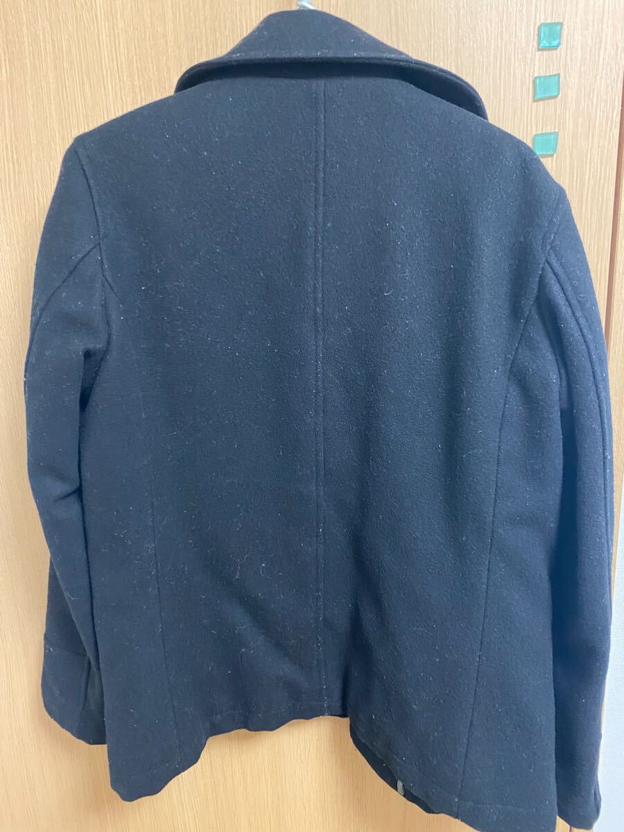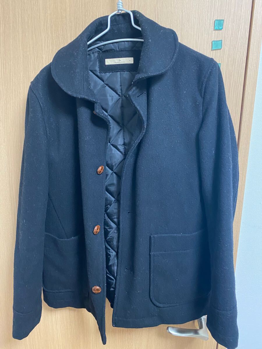 ウール混合素材の黒いチェスターコート、ボタン付きでポケットあり。