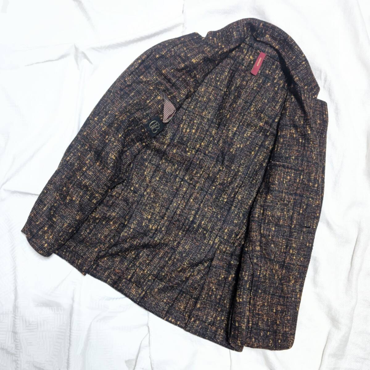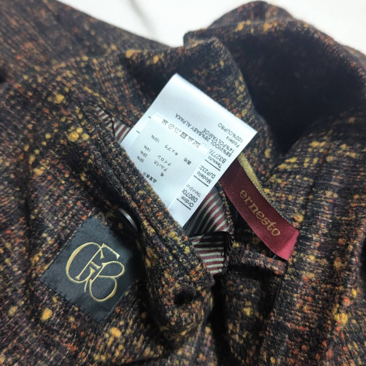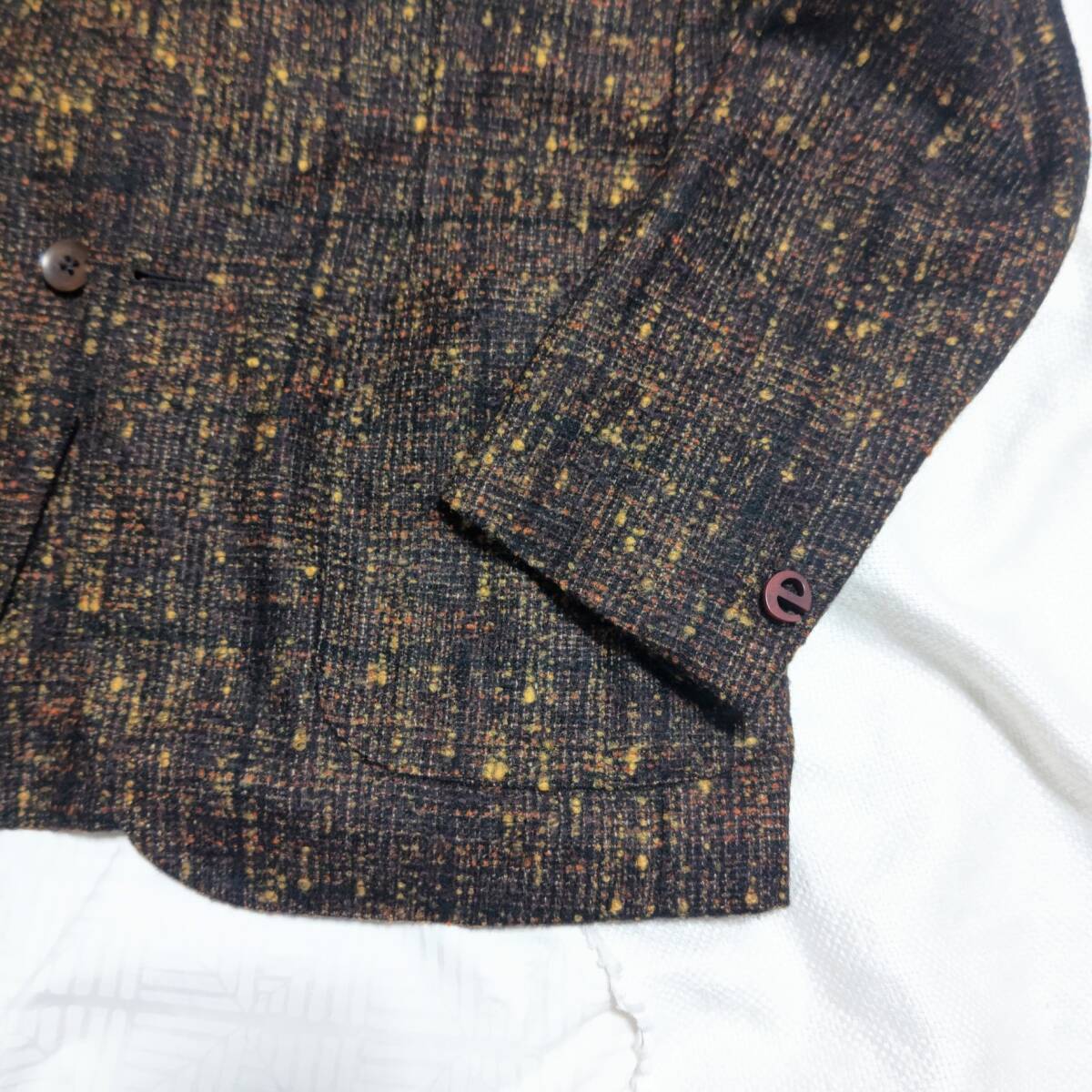 フロントはボタンは2B、袖裏のみの裏生地、袖先はボタンが付いたのみのデザイン。全体的にはスッキリとしたラインで着用がいただけ、袖先のブランドアイコンの【 e 】がさりげなく目を引くセンスのある一着です。