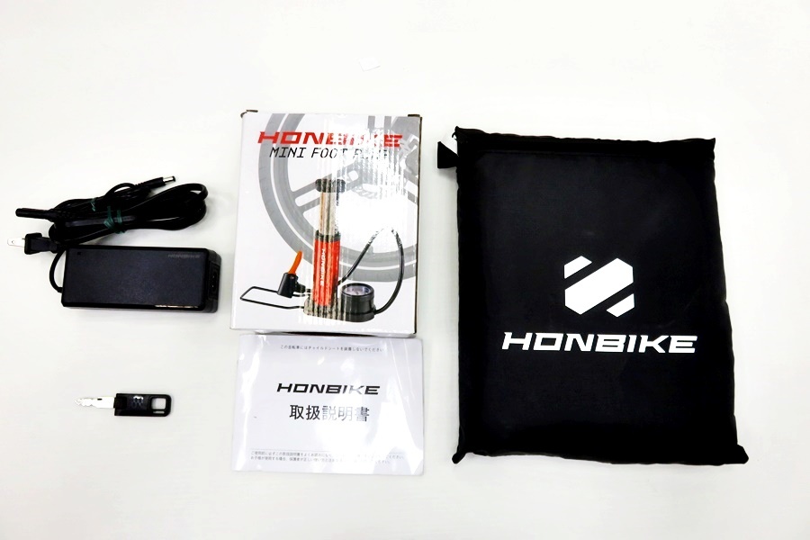 付属品は充電器、鍵1つ、自転車カバー、フットポンプ、取説になります。