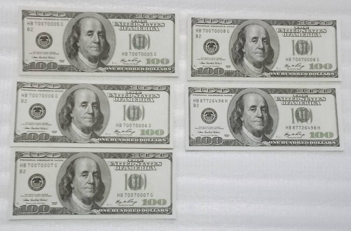 未使用◆アメリカUSドル/100ドル札5枚=500ドル分◆連番4枚あり/国内銀行にて両替後長期保管