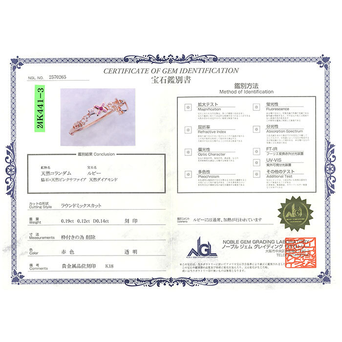 素材 | K18 ダイヤモンド0.14ct ルビー0.12ct ピンクサファイア0.19ct |