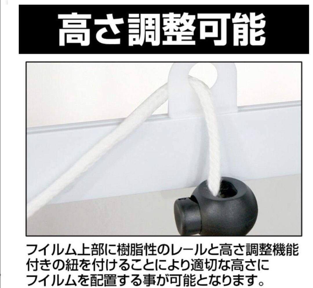 ・フイルム上部に樹脂性のレールと高さ調整機能付きの紐を付けることにより適切な高さにフイルムを配置する事が可能となります。