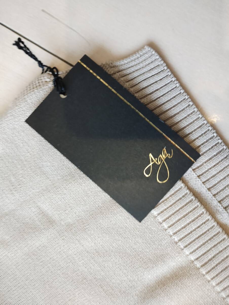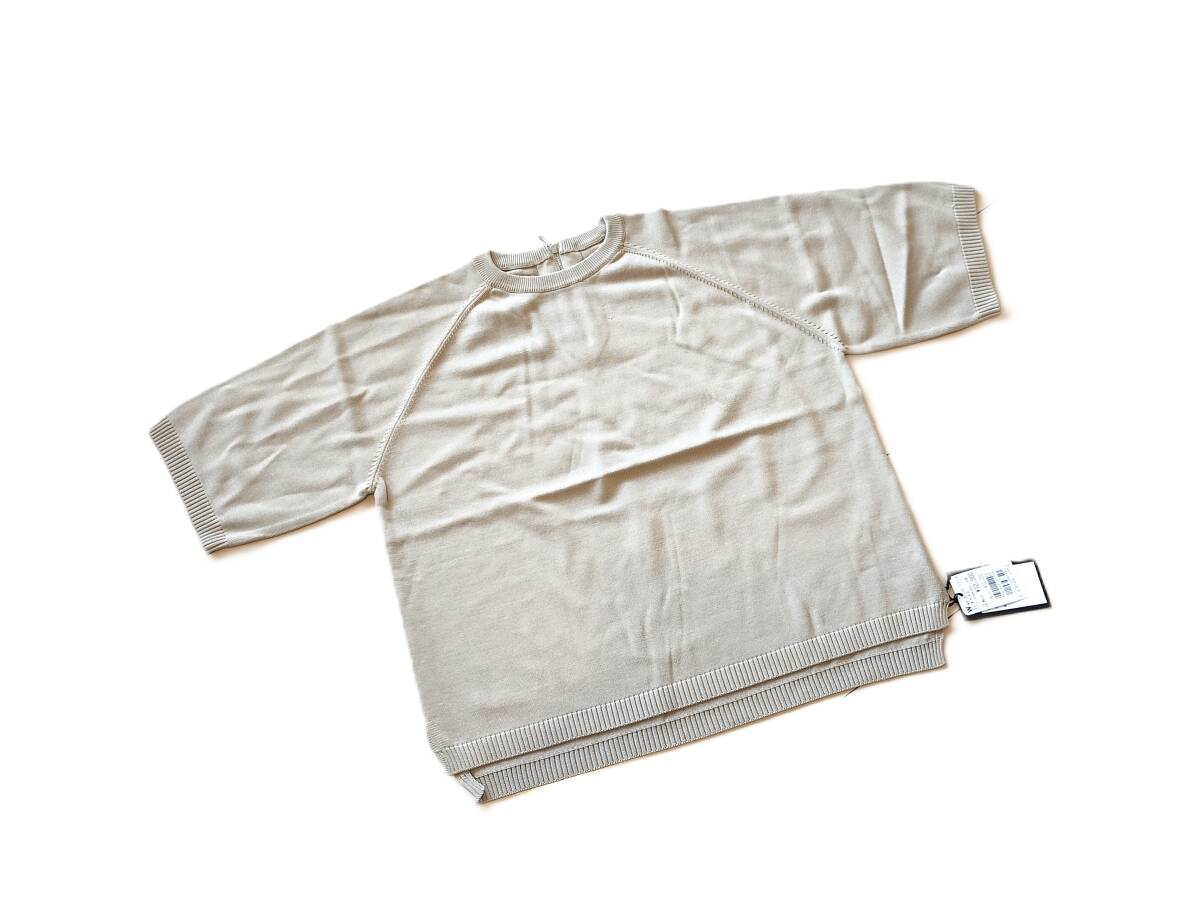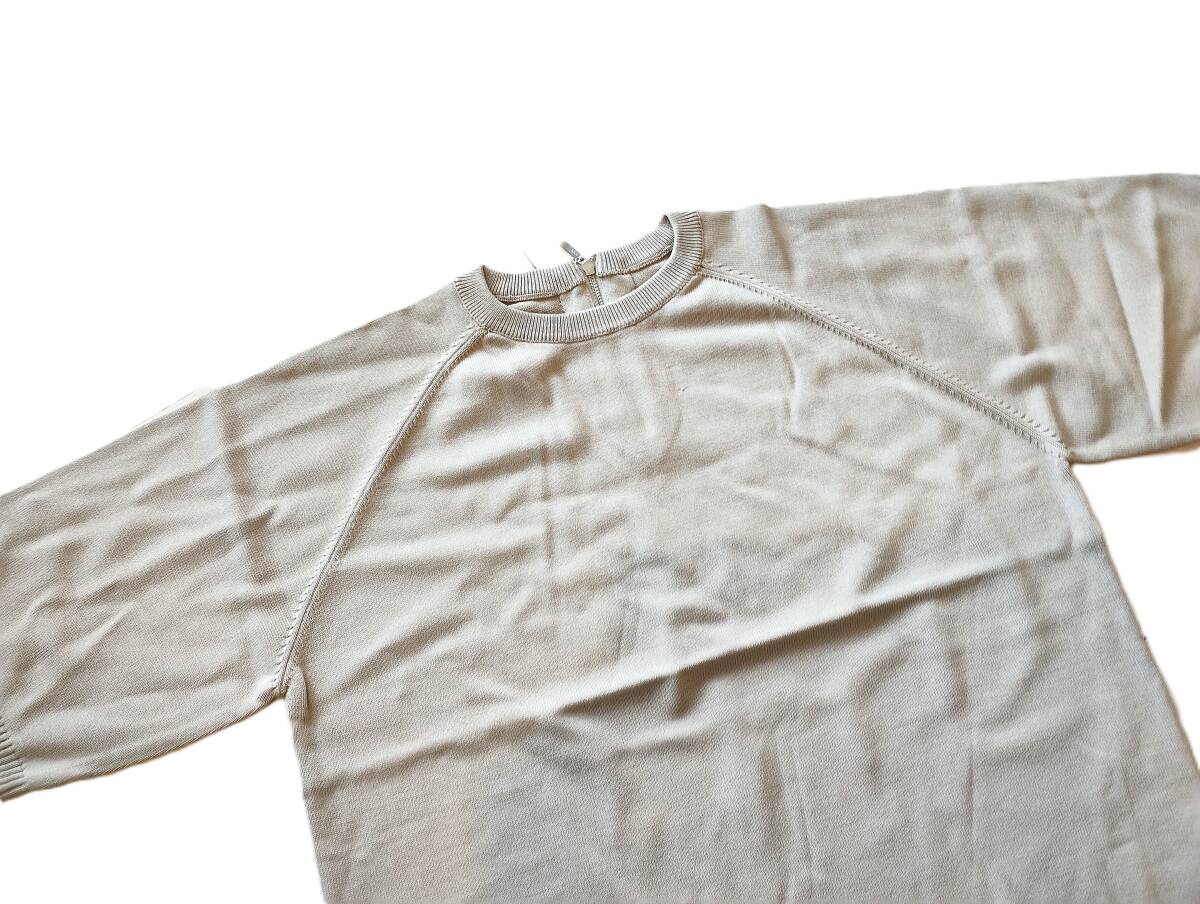 シンプルなバッグファスナーニットです。ファスナーの明け具合で襟ぐりの調整ができます。定価は¥12000です。