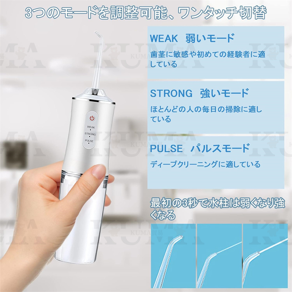 【3つモード】口腔洗浄器には、弱い(weak)、強い(strong)、パルス(pulse)の3つのモードがあります。ボタンを押すだけで、お客様に合ったモードに切り替わります。歯洗浄器には4種類のノズルが装備されており、それぞれが日常生活のニーズを満たすために異なる機能を備えています。 360°回転可能なノズル設計により、歯ブラシでは届きにくい部分に到達できます。<br>