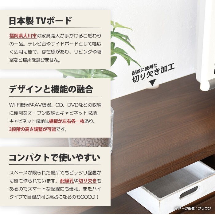 特  徴ハイタイプで広がる視界、使い勝手と美しさが融合した日本製TVボード。
