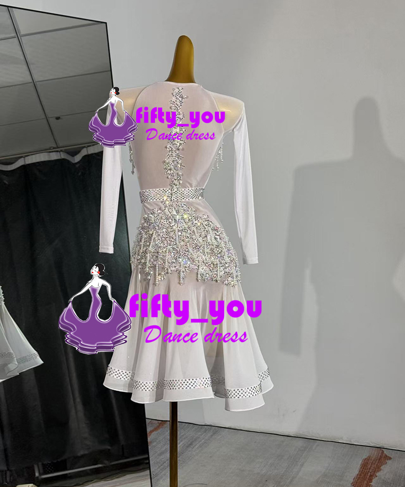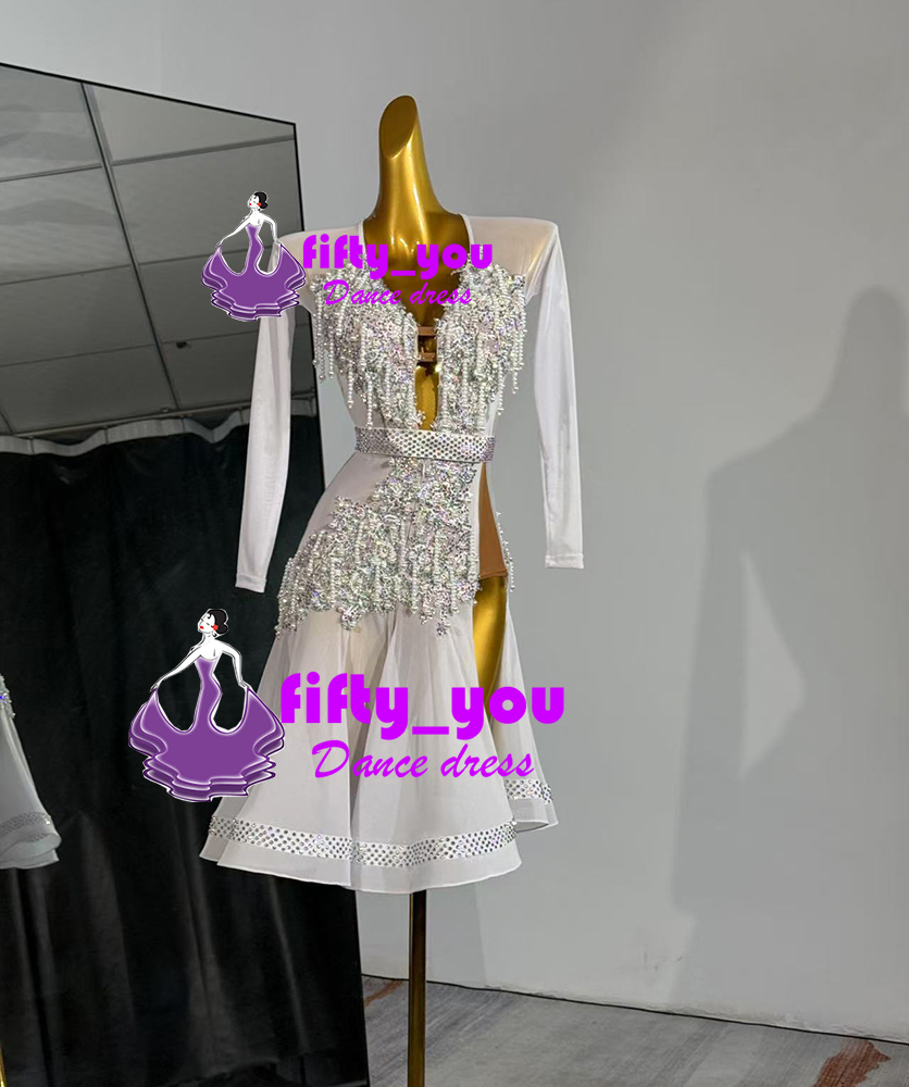 新品fifty_you レディース社交ダンス衣装  サイズセミオーダー ラテンドレス パールとストーン飾り ルンバ衣装 ホワイト