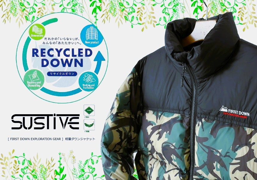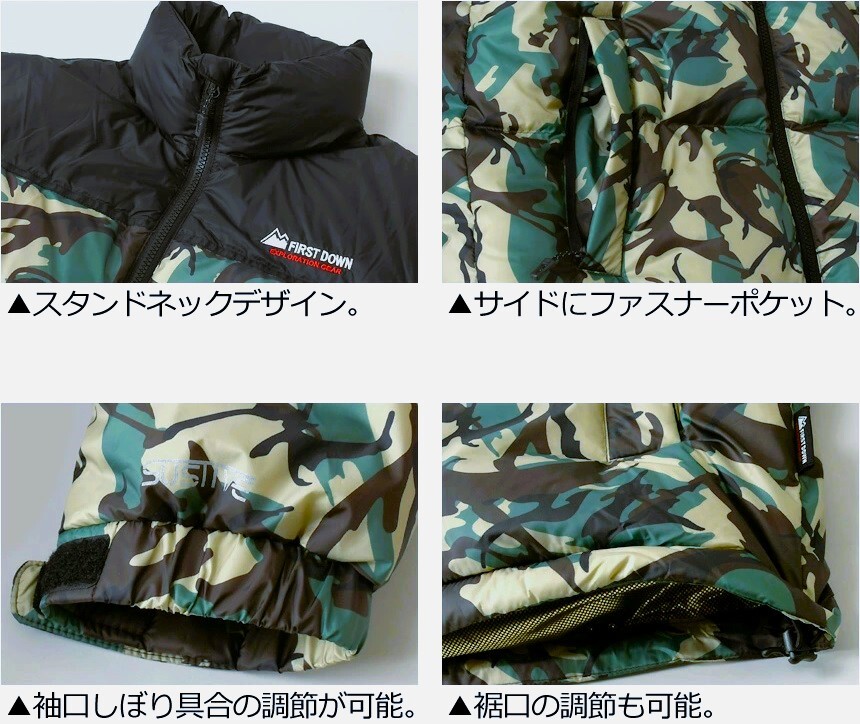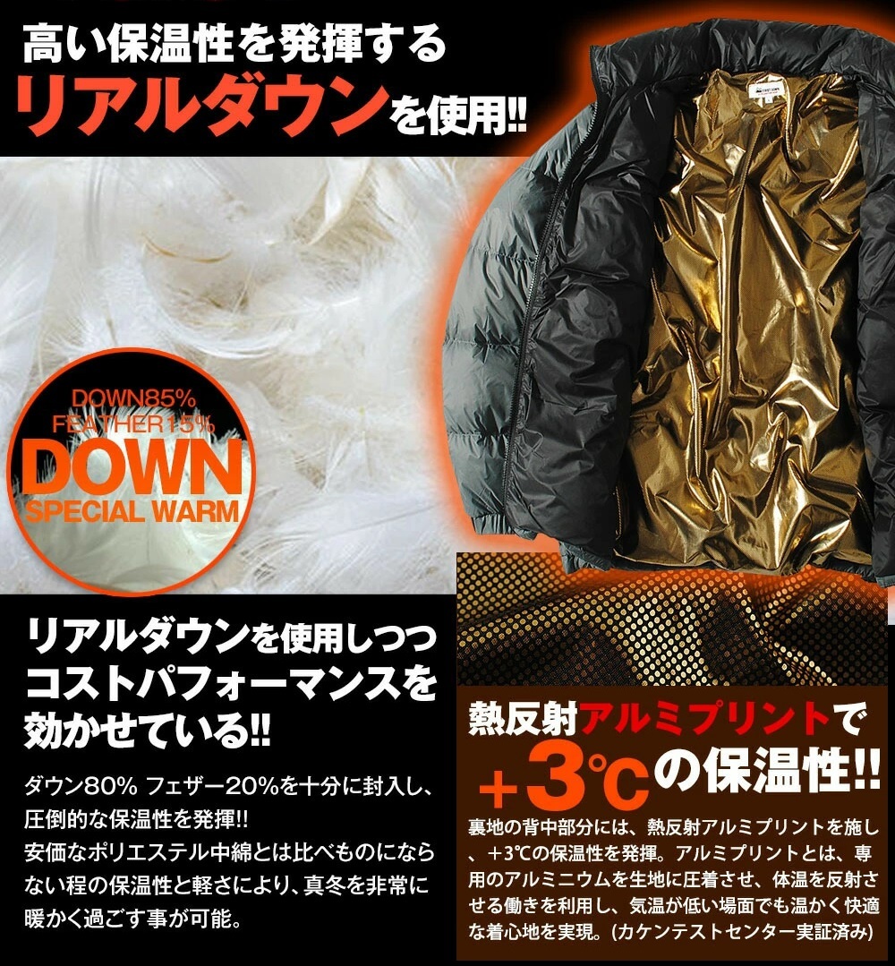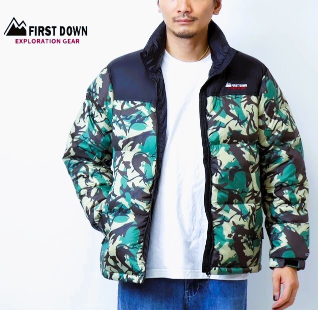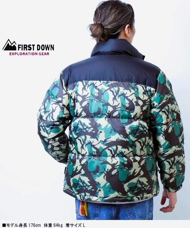 【FIRST DOWN】★超防寒・撥水仕様・超軽量★裏アルミ発熱・ダウンジャケット【●新品未着用タグ付き●】品番:7452608 99、定価:18,980円。表記サイズ:L、着丈71cm、身幅62cm、袖口12cm、袖丈63cm、裾幅60cm、肩幅50cm。生地:ナイロン100%、中綿:ダイン80%/フェザー20%。