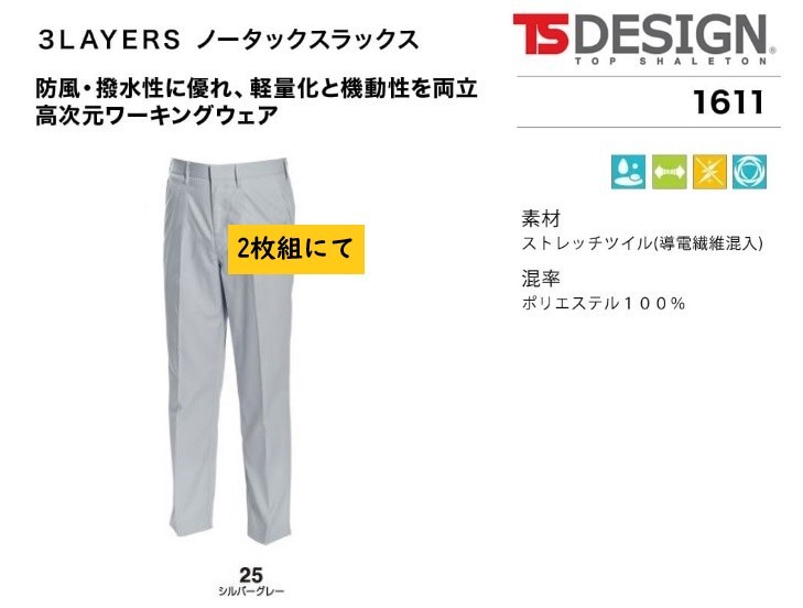 ビックイナバ特価◆TSDESIGN 1611≪秋冬≫3LAYERSノータックスラックス【25シルバーグレー・W96cm】定価1枚8250円の品、2枚即決2980円