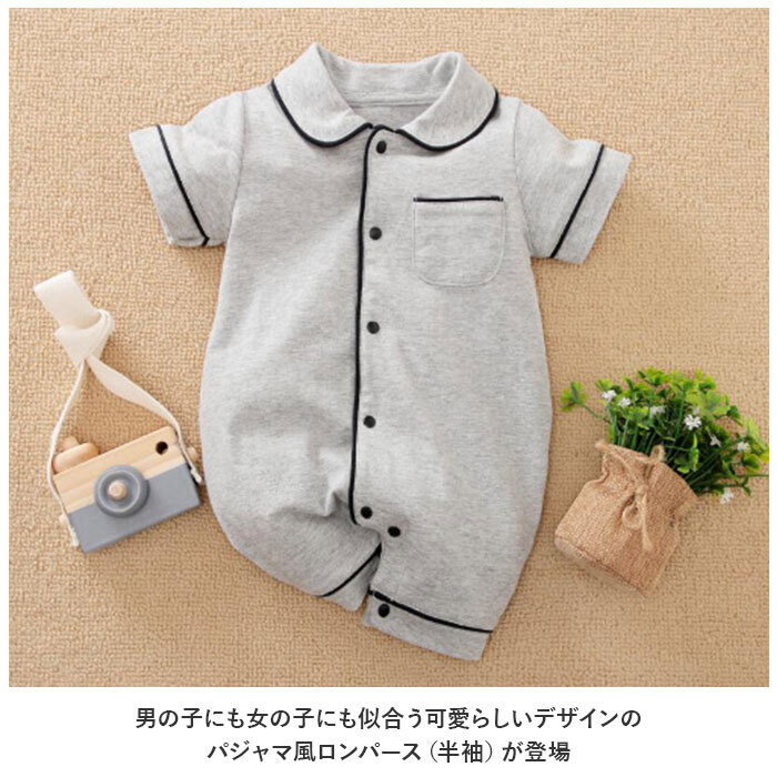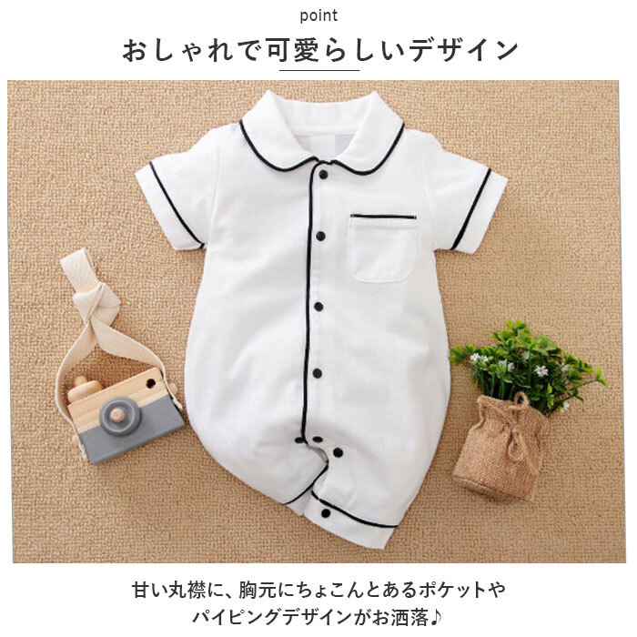 商品説明 | ・・男の子にも女の子にも似合う可愛らしいデザインのパジャマ風ロンパース(半袖)が登場 ・【肌に優しいコットン素材】 ・柔らかな肌触りで、汗をいっぱいかく赤ちゃんでも快適に過ごせる! ・【前開きでお着替えらくらく】 ・前開きのスナップボタン仕様だから、ボタンの開閉もらくらくでお着替えも楽ちん。股下部分まで開閉できるので、おむつ替えしやすいのも嬉しい♪ ・【おしゃれで可愛らしいデザイン】 ・甘い丸襟に、胸元にちょこんとあるポケットやパイピングデザインがお洒落♪ ・【外付けのタグ】 ・赤ちゃんの柔らかい肌を傷つけないように、タグは肌に触れない外側付き。チクチクしないので赤ちゃんもご機嫌♪ ・【ギフトにも最適】 ・男の子にも女の子にも似合うデザインなので、出産祝いなどのプレゼントにもオススメ♪ |
