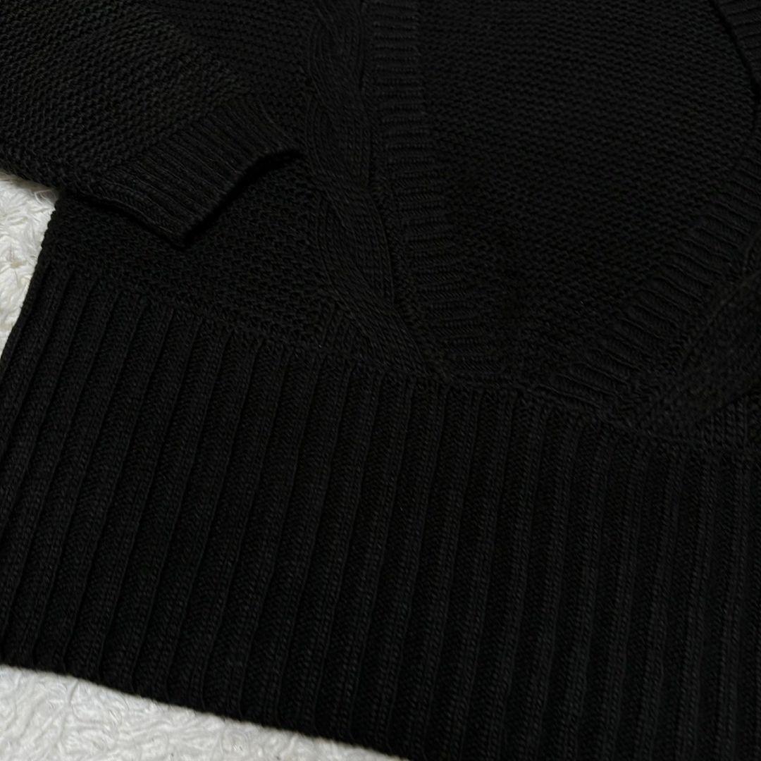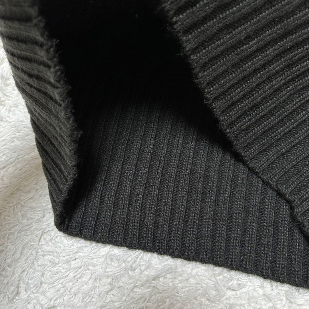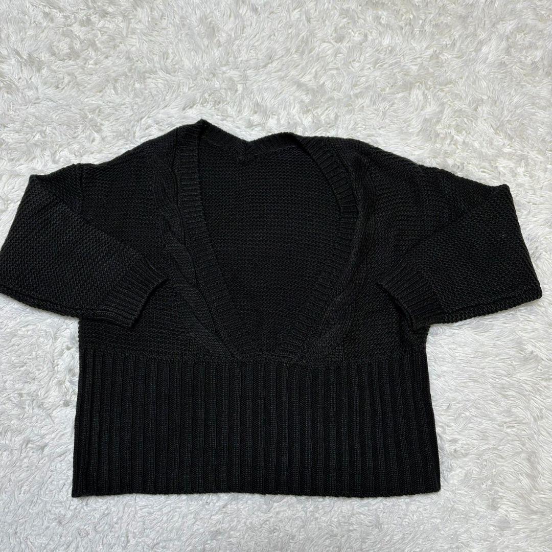 ブラックのVネックニットセーター、リブ編み裾でスタイリッシュ。