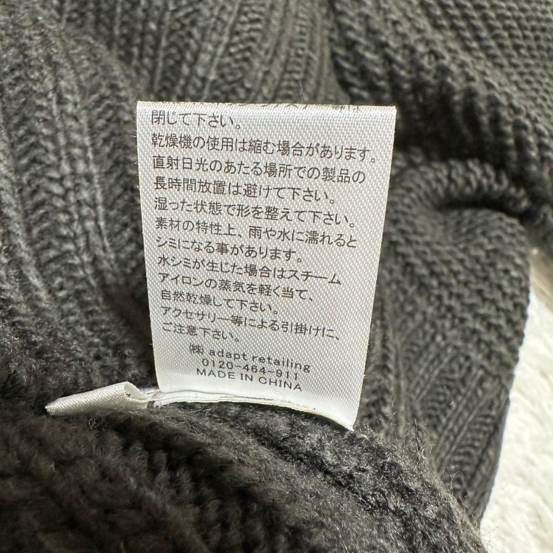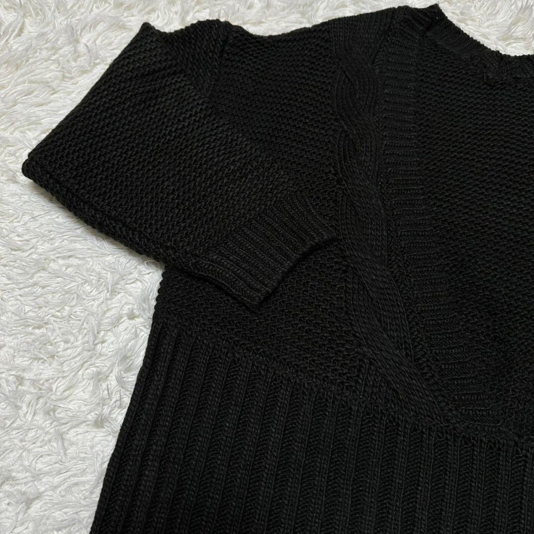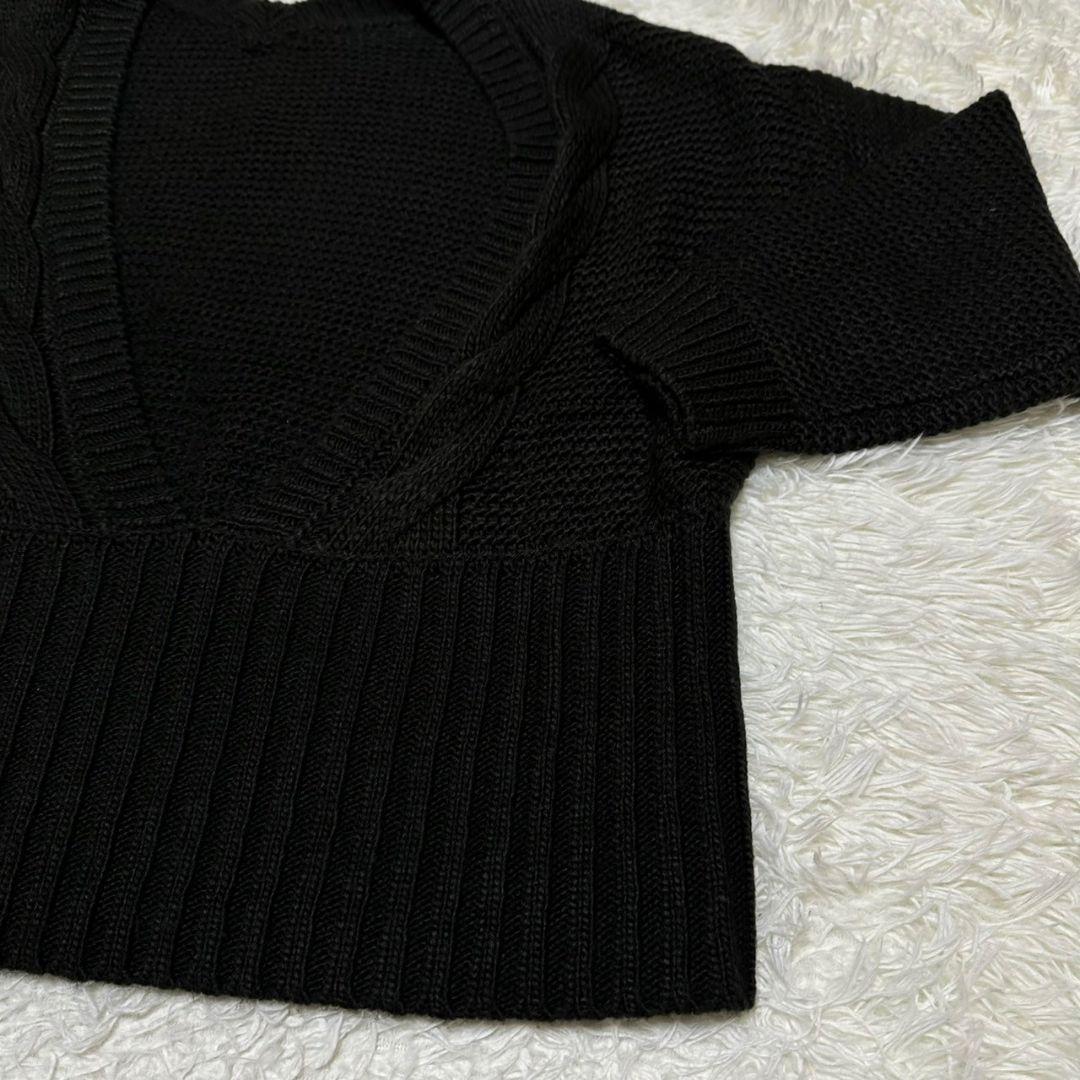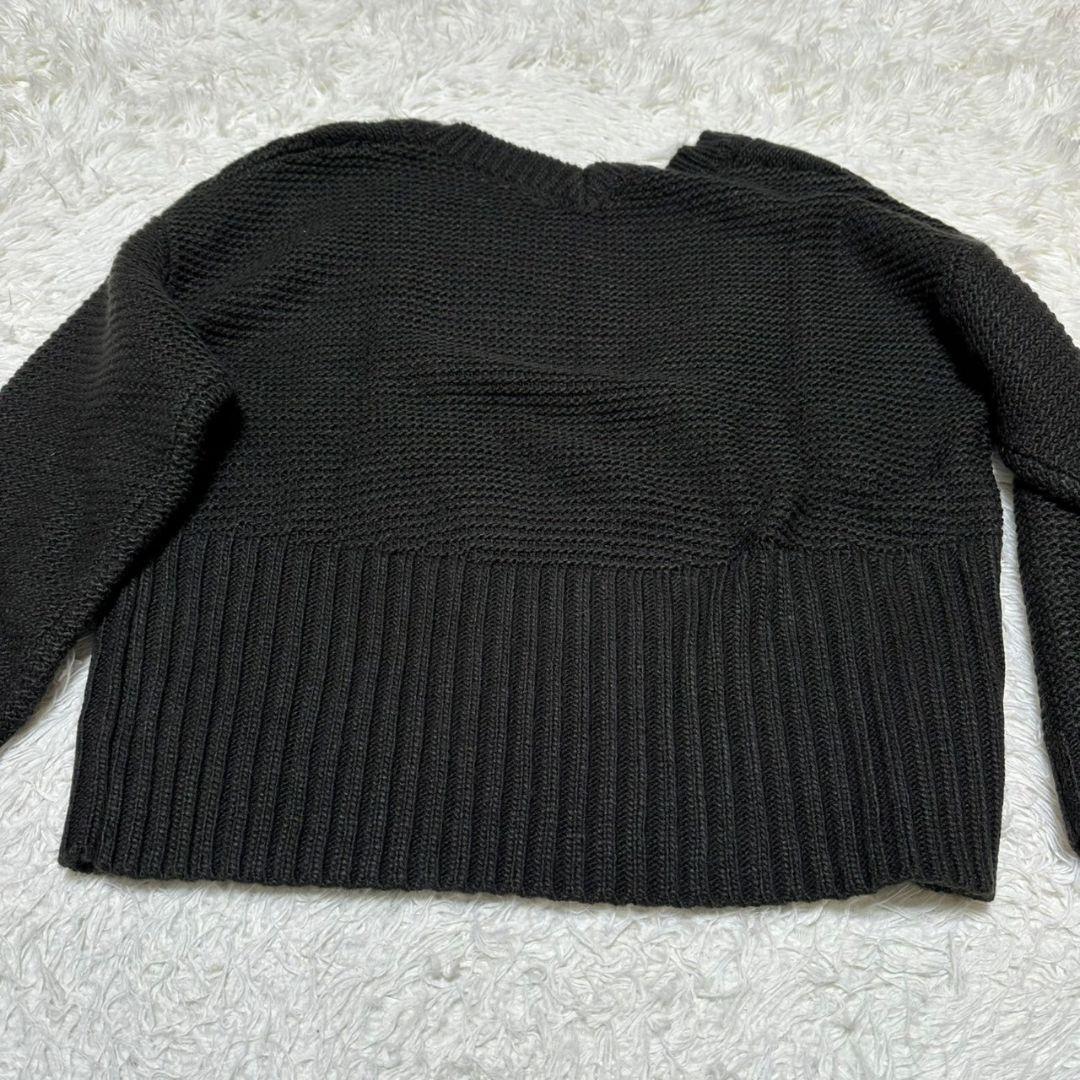ブラックのVネックニットセーター、リブ編み裾でスタイリッシュ。