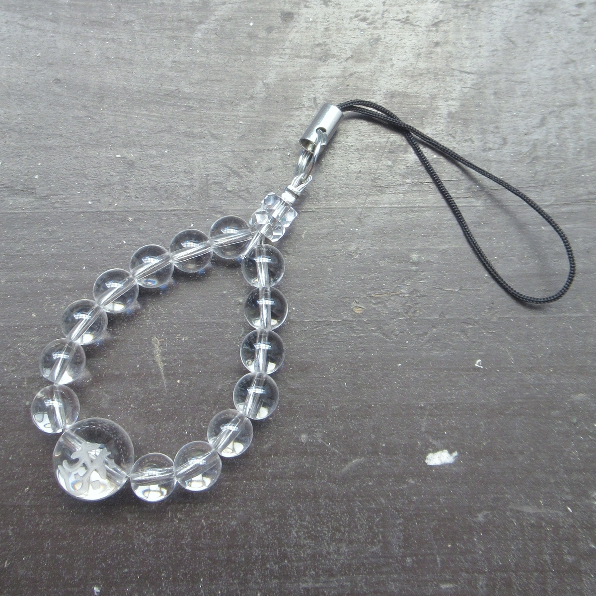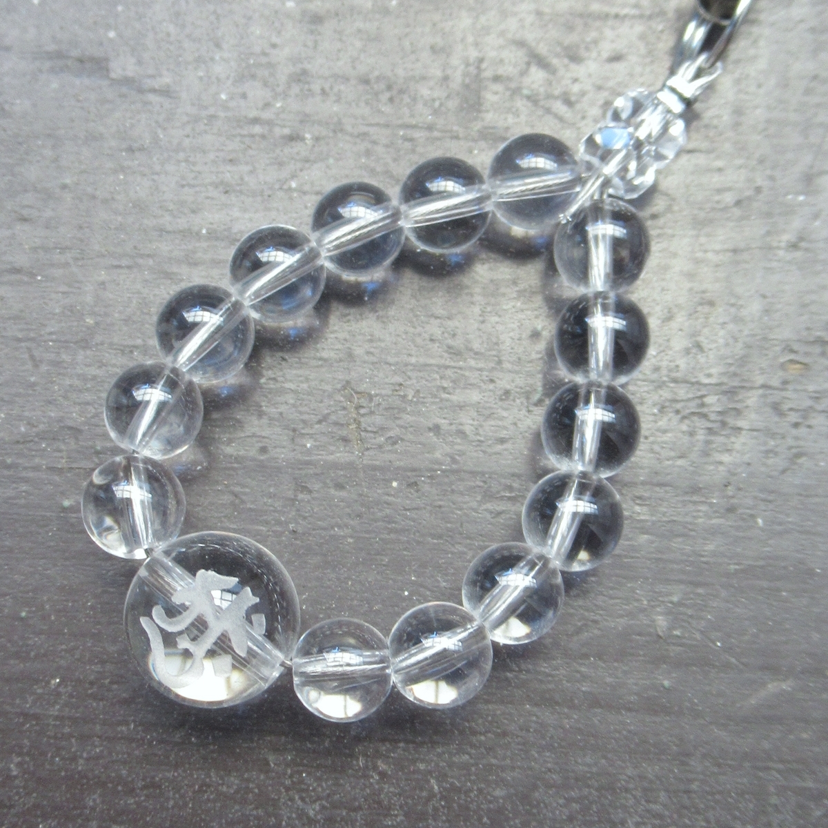 6ミリ玉水晶を主に、胎蔵界大日如来を表す梵字「アーク」が手彫りされた10ミリ玉水晶を中央に配しました。