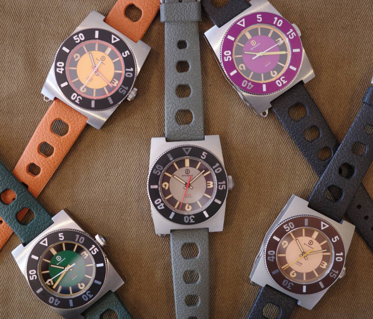それぞれ5気圧の耐水性、カラーは5色、サンドイッチダイヤル構造