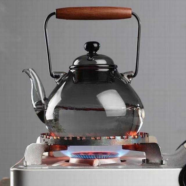 お水入れてガスレンジとヒーター加熱可能です。IHコンロは使用不可です。麦茶などを煮出した熱いまま入れても変形したり何かが溶け出したりする心配なく使えます, プラスチックと違ってガラスはお茶の持ち味を保つことができます