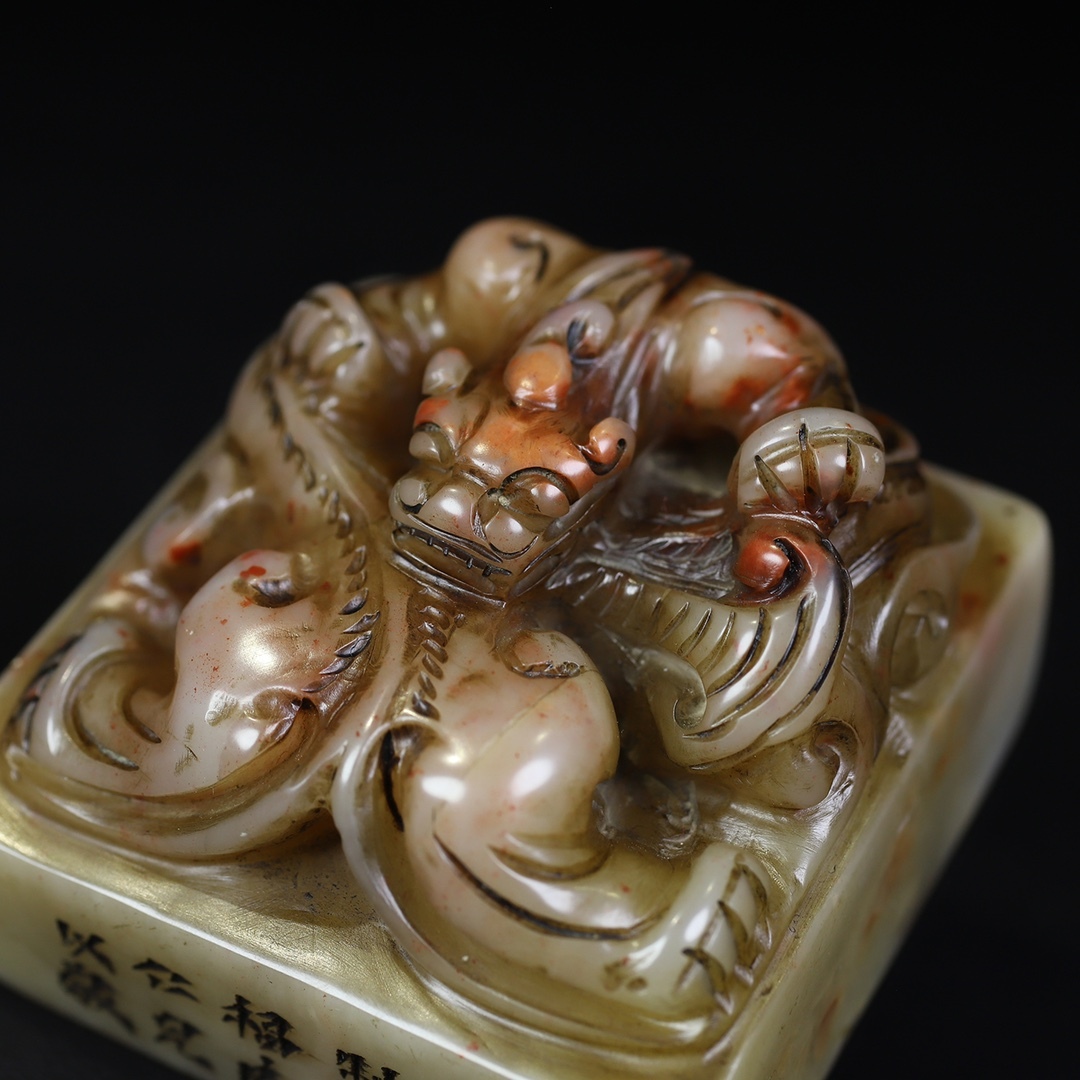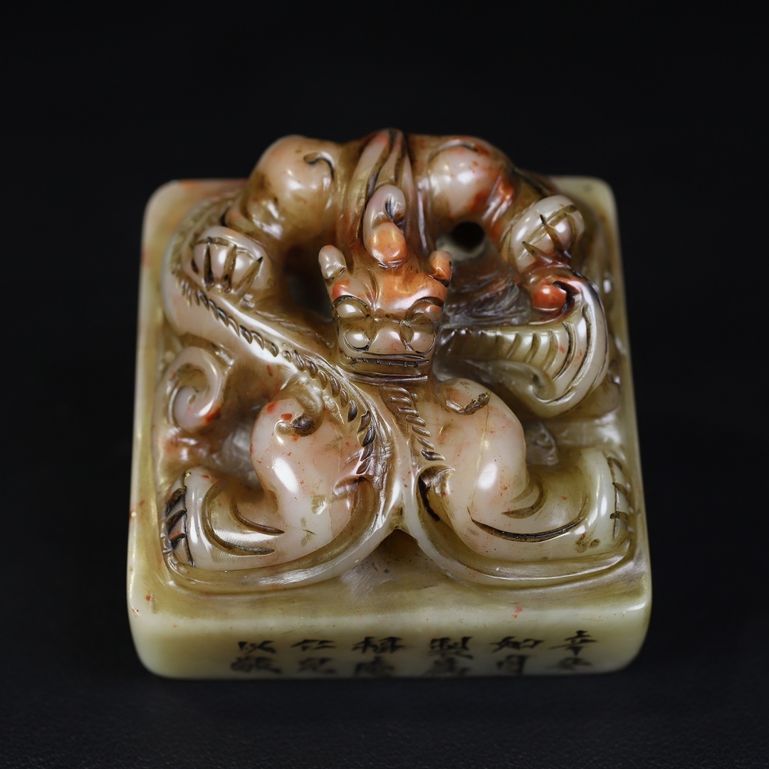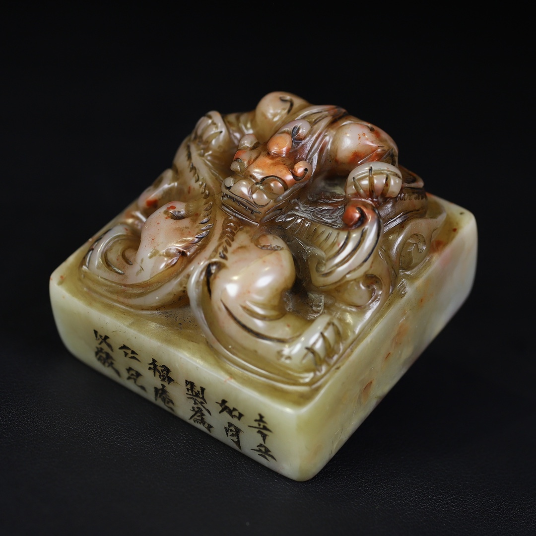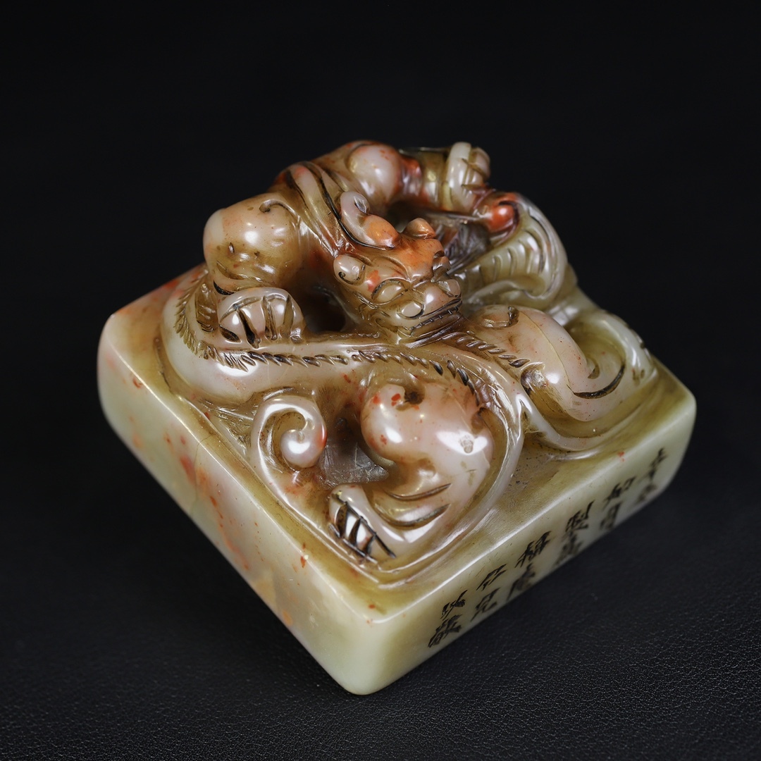 旧蔵 【清代篆刻家 鐘以敬】寿山芙蓉石 キレート龍ボタン印鑑 天然石 手彫 篆刻 古印材 極細工 中国古玩 古美術 骨董品 203-03
