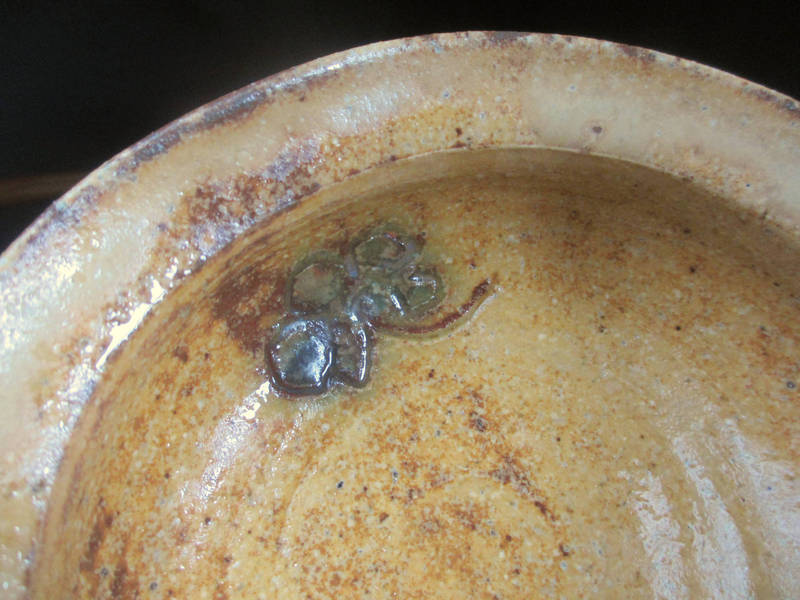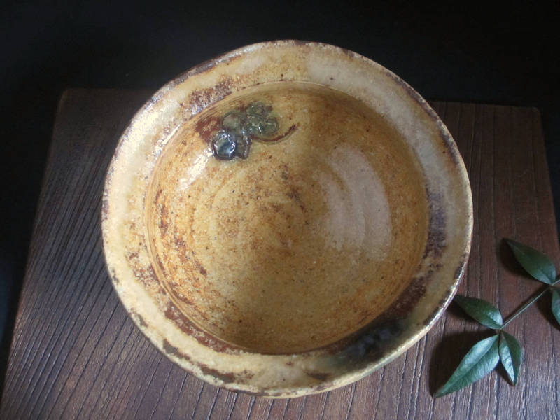 ザックリとした土味に、渋く輝く「山柿紅葉」とも言われる、しっかりとした作りの小鉢。しっとりと潤いのある油揚げ肌の様な輝く表面に「小花文」を彫り入れ、そこにさりげなく緑色の「タンパン」を加えた古風な意匠。 焼成時にできた「こげ」の景色は、千利休の「わび・さび」を髣髴させてくれます。 一つひとつ丹精込めて作られた逸品、浜田敦士氏の黄金色に輝く作品をお楽しみ下さい。和え物や煮物などに、おもてなしのひとときに使い勝手の良い小鉢。