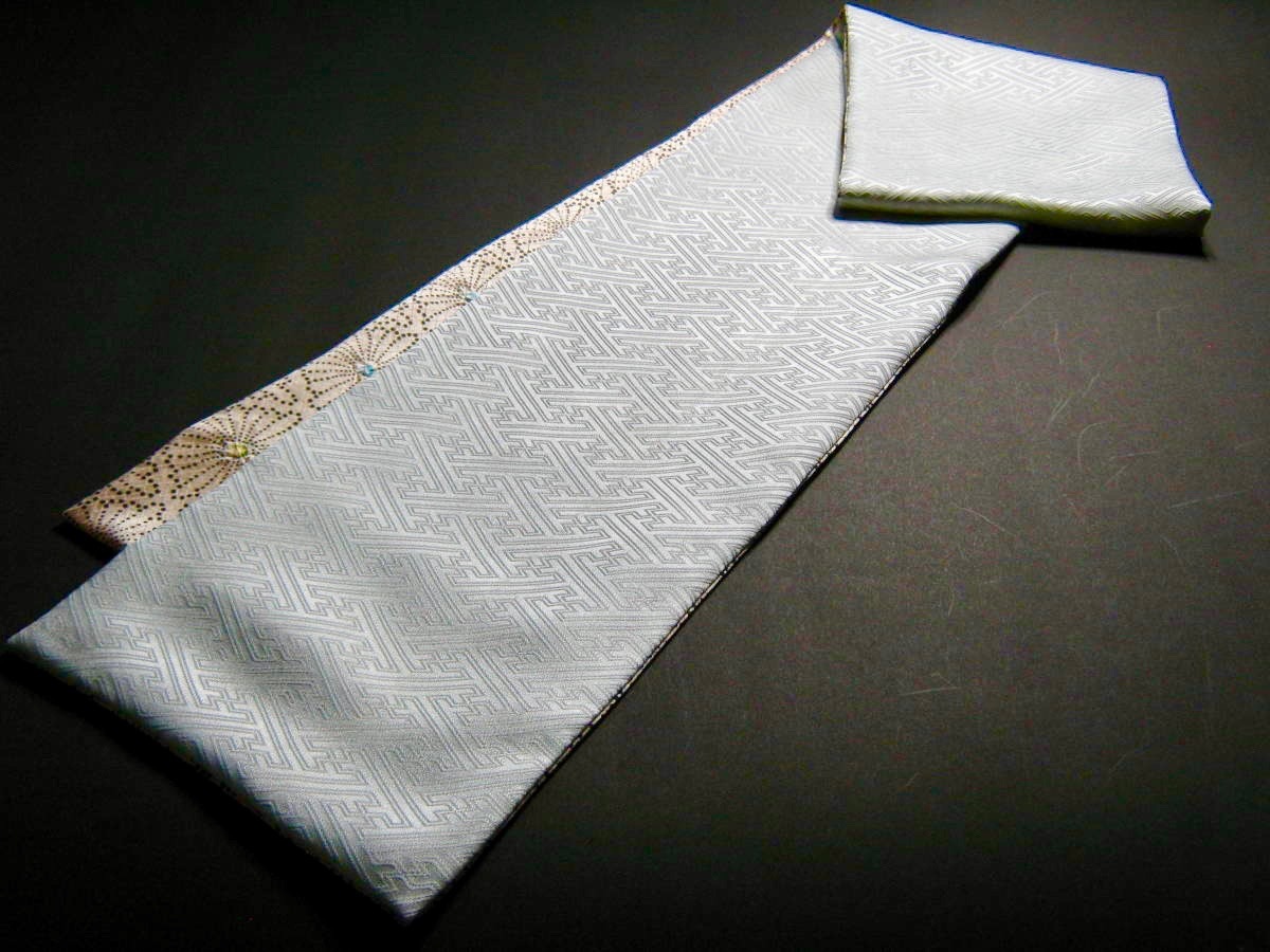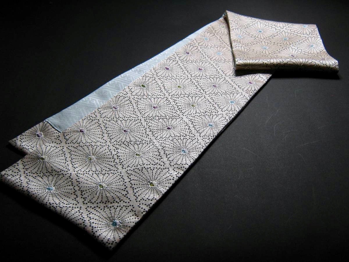 着物リメイク リバーシブルロングストール 143×16【正絹綸子/3色絞り入花菱 黒 薄くりーむ地 × 正絹綸子/紗綾型地紋 薄藍地】