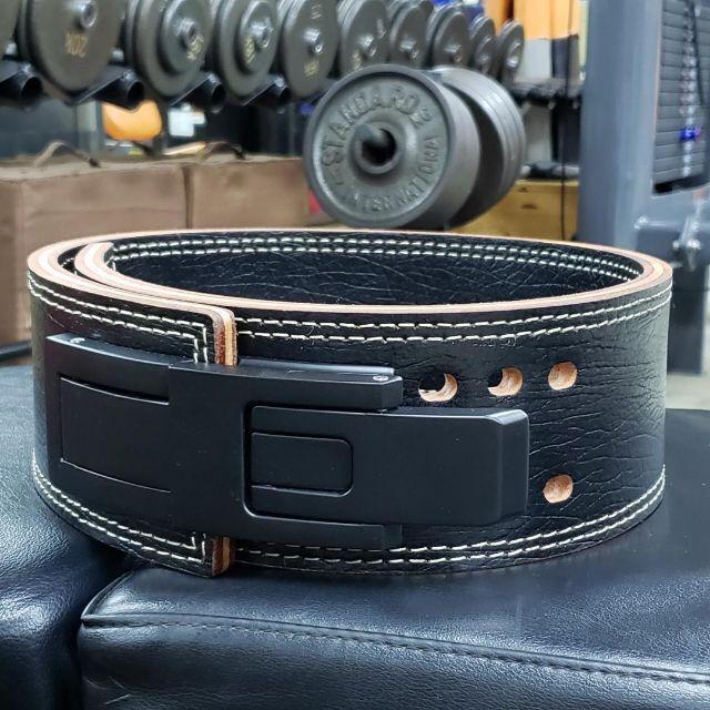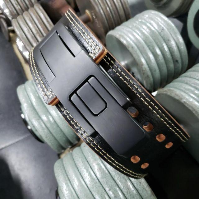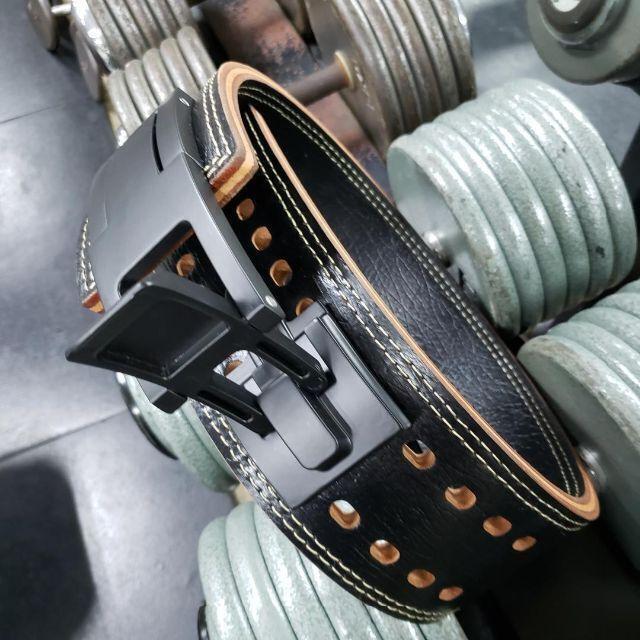 レバーアクションによりワンタッチで着脱締め付け可能なトレーニングベルトになります。