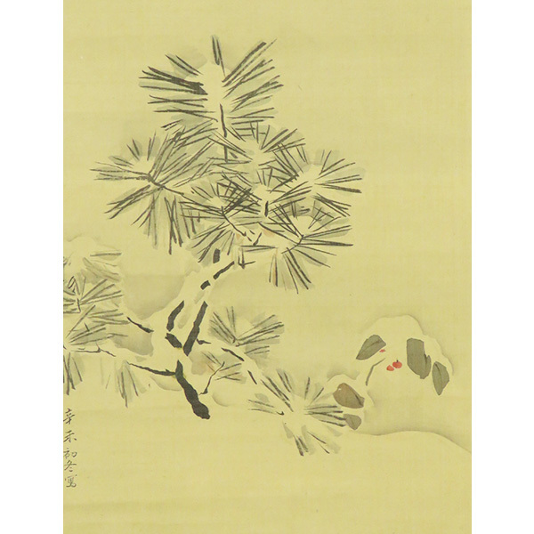 肉筆・紙本淡彩 雪中花鳥図。合せ箱。