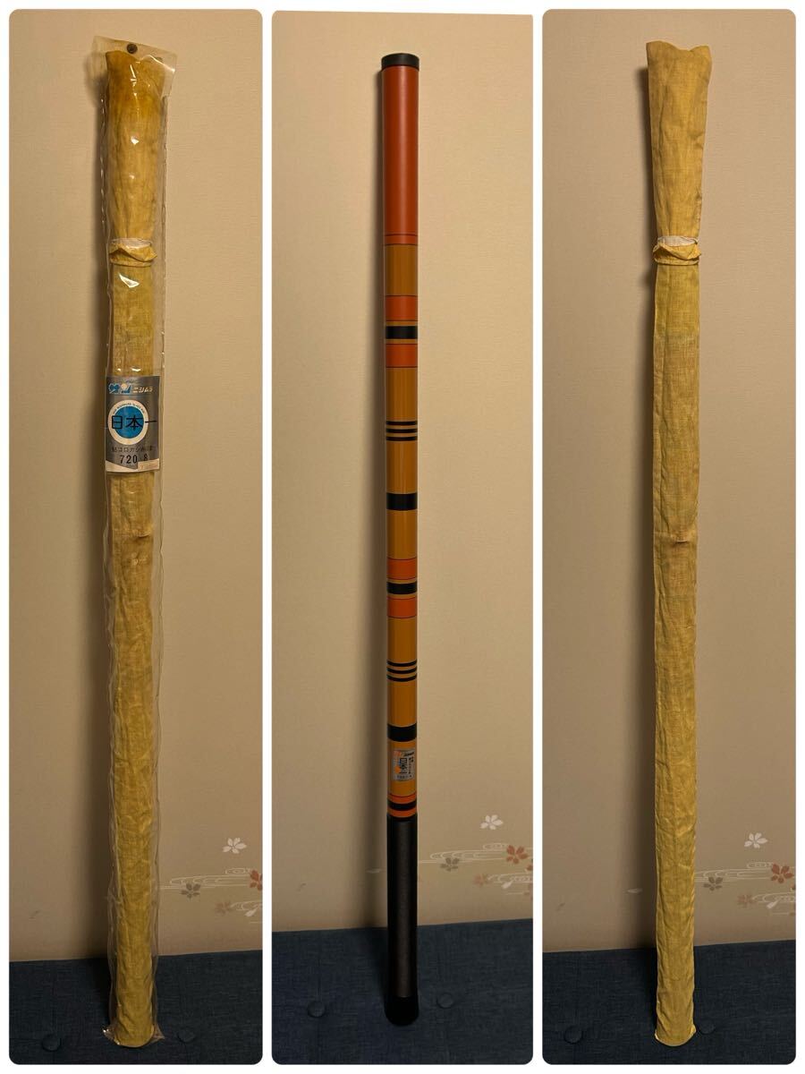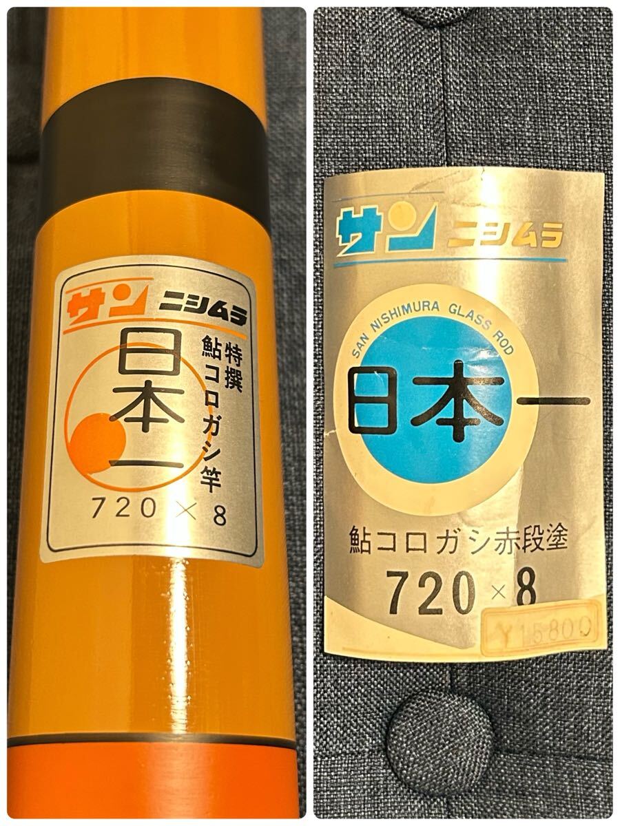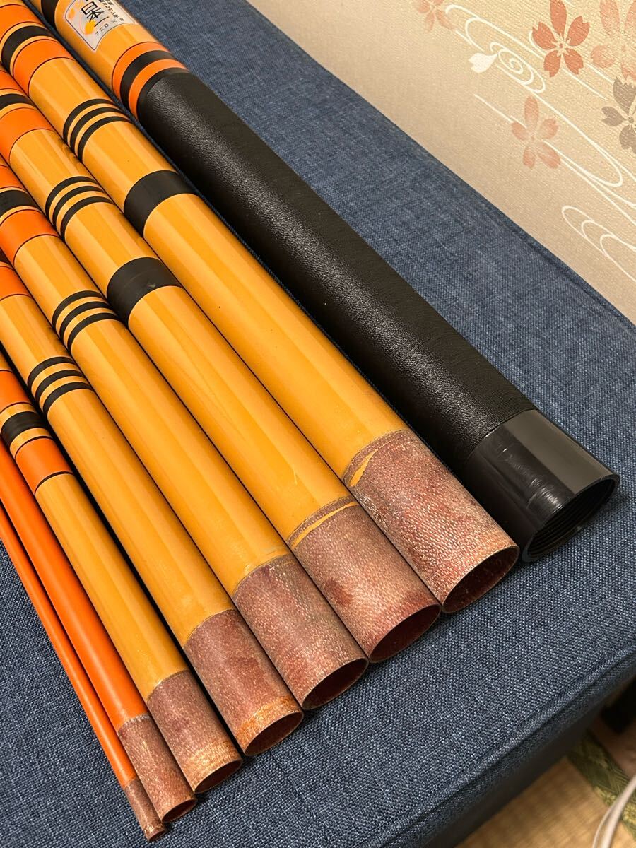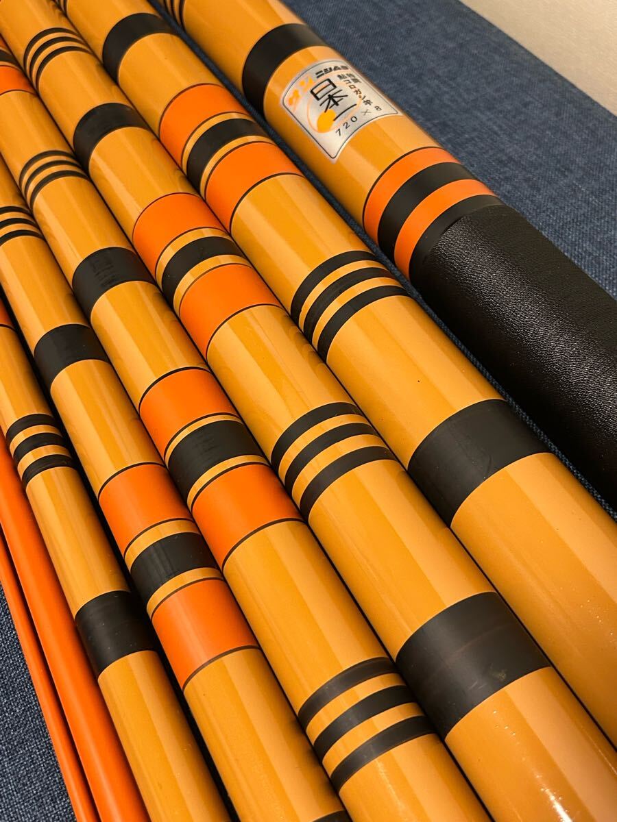 7.2mの8本振出、仕舞寸法は約123cm、自重は約927gとグラスロッドですので重いです。珍しい古い商品ではあります。