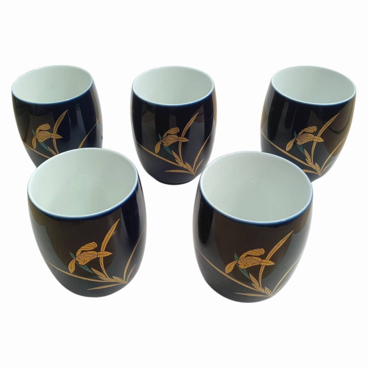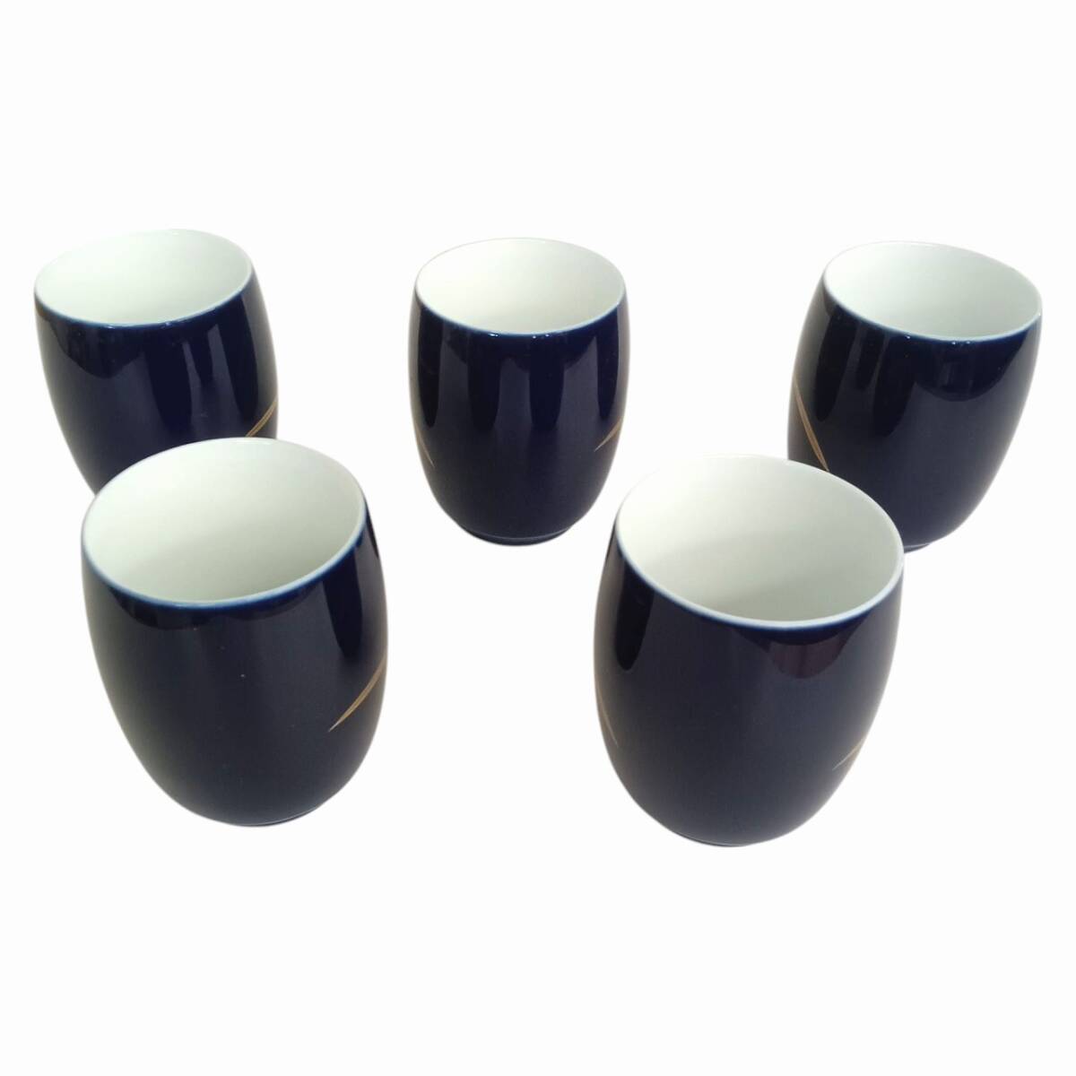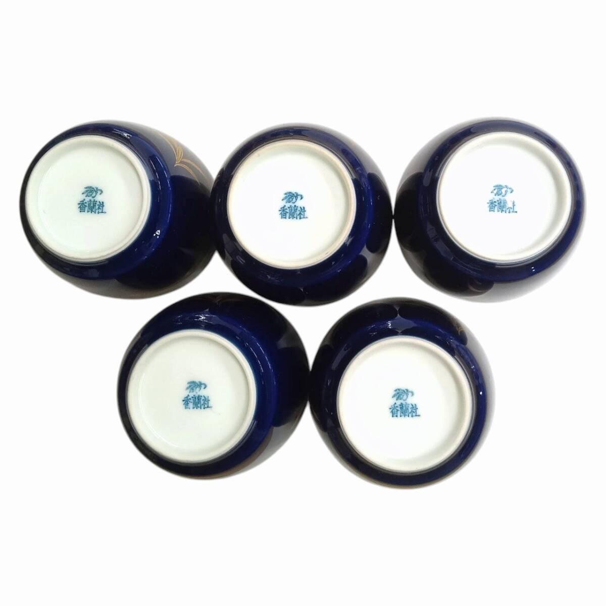 ¥1~ 香蘭社 瑠璃金彩 湯呑み 花柄 藍色 紺 ネイビー 陶器 茶器 5客揃 セット【中古】