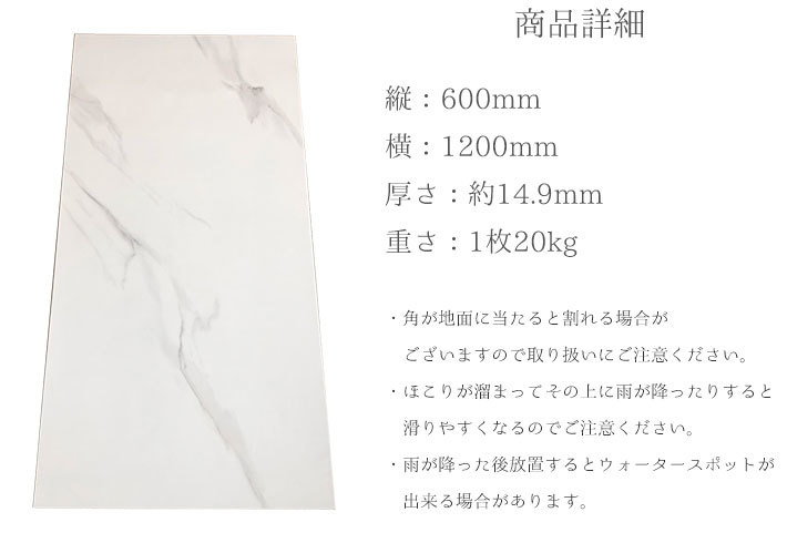| 商品説明 | ・高耐久・高強度 重量のある車両にも対応!設置したのが2018年から一度も割れや欠けなどはありません!長期間美しさをキープすることができます♪ ・お手入れも簡単 汚れは水でさっと落ちるので清潔感を維持することが出来ます ・高級感のあるデザイン 本物の大理石のような質感で駐車スペースをスタイリッシュに演出 商品名 人工大理石タイル 商品内容 120×60cmのタイル 商品詳細 ■縦:600mm ■横:1200mm ■厚さ:約14.9mm ■重さ:1枚20kg ・角が地面に当たると割れる場合があるので取り扱いに注意してください。 ・ほこりがたまってその上に雨が降ったりすると滑りやすくなるのでご注意ください。 ・雨が降った後放置したままにするとウォータースポットが出来る場合があります。 |