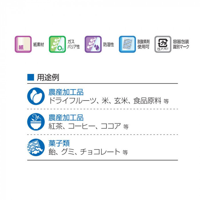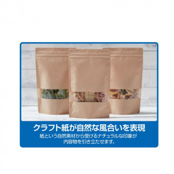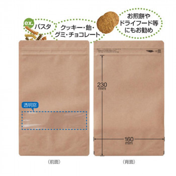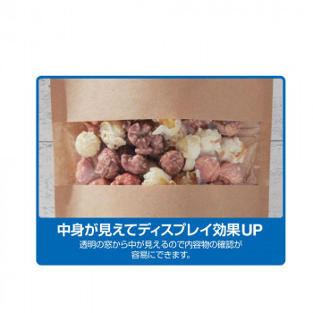 | 透明の窓から中身が見えるのでディスプレイ効果も高く、ドライフルーツ・お米・ナッツなどの食品原料はもちろん、クッキー・グラノーラなどの加工食品にもオススメです。ガスバリア性・防湿性の高いフィルムを使用。 ※この商品の保管は高温多湿・直射日光を避けてください。 ※電子レンジでのご使用はできません。 ※可燃物ですので、火のそばに置かないでください。 ※袋の角に注意してください。 ※湿気、酸化、変色等の影響を受けやすい商品の包装には充分ご注意ください。 |