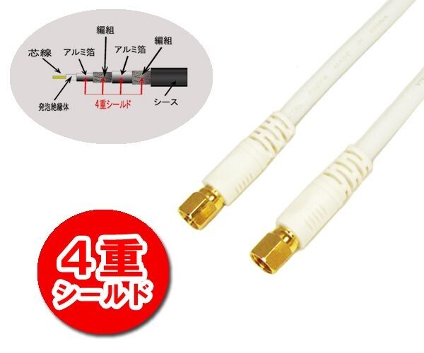 ☆ねじれ防止設計:配線後のケーブルねじれを防止するためねじ式プラグ部分は接続後もケーブルが回るように設計されています!これにより機器の端子部分へのストレスをなくします。 ■4K8K放送対応。地デジ・CS・BS・BSデジタル・UV・CATV等、現在放送されている全ての放送に幅広くご使用になれます! ■テレビ・パソコン・DVD・ビデオ等、幅広い機器でご使用可能です! ■安心の4重シールド構造!■金メッキプラグ採用! ■プラグ加工部分をシールドしていますので外来電波を遮断します! ■地上デジタル対応のS5C-FBケーブル! ■RoHS指令対応! ※簡易パッケージ『 年末年始休暇のお知らせ 』 ■誠に勝手ながら、12月29日~1月3日は冬季休業とさせて頂きます。 ※休業日前の最終出荷は12/28(木)13:00迄にご入金・決済の確認ができたご注文までとさせて頂きます。 ■休業日中のご注文の対応、商品の発送、お問合せ等には、1月4日(木)以降に順次対応させて頂きます。 【ご覧いただきありがとうございます。弊社は50年以上に渡りTV関連のケーブルを販売しております。お困りの際は先ずはお気軽にご相談ください。営業時間は平日9時~17時(12~13時を除く)となります。小型の送料無料商品についてはメール便にて発送させていただきます。メール便は到着まで約2~4日ほどお時間がかかり、ポスト投函となりますのでご了承下さい。その他の商品や11000円以上の商品は宅配便にて発送させていただきます。なお、土日祝日は休業となりますので、出荷・お問い合わせについては行っておりません。ご迷惑をおかけしますが、予めご了承下さいますようお願いいたします。】