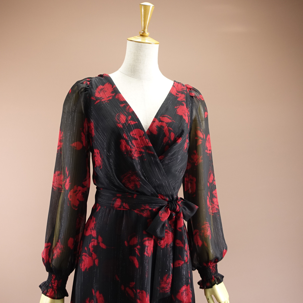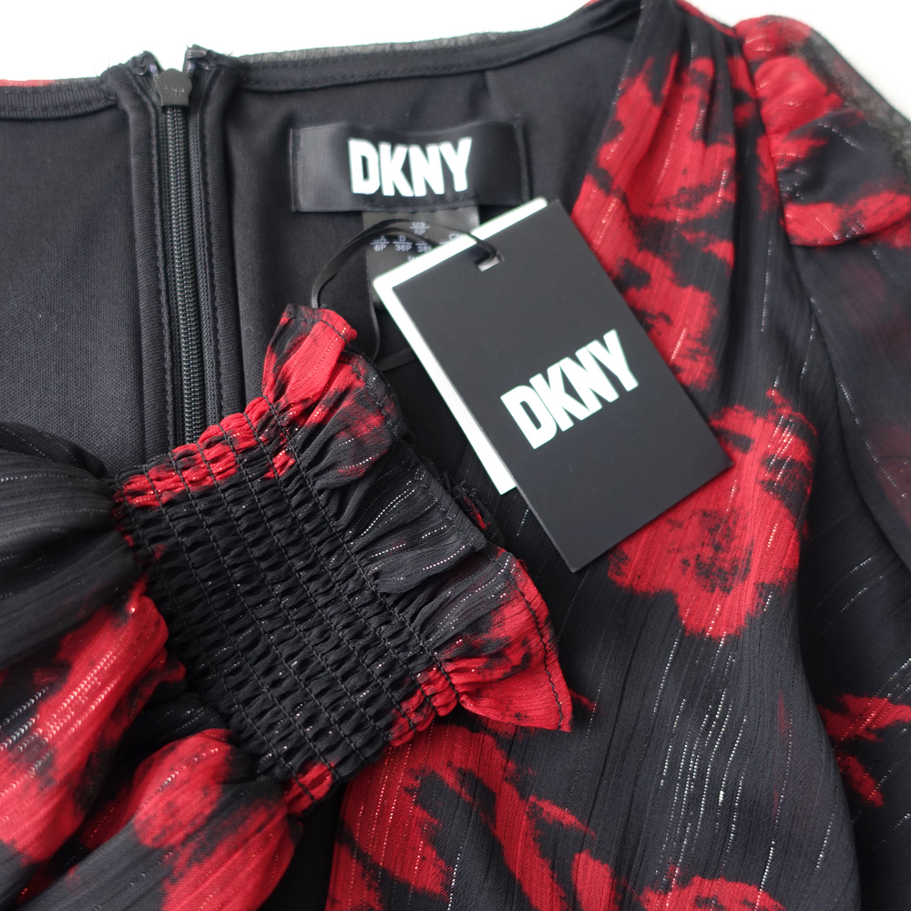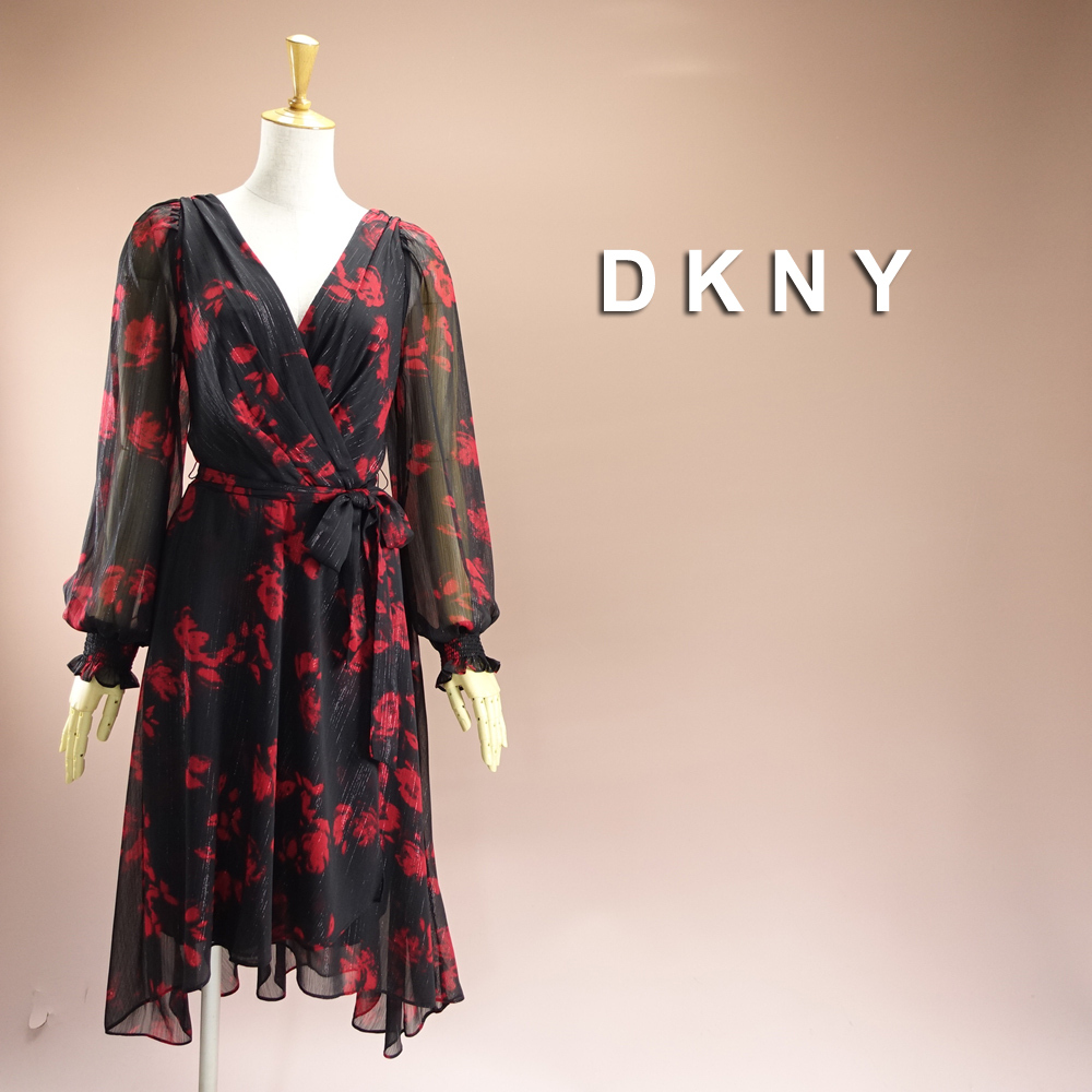 新品.DKNYダナキャラン 13号 赤 黒 ワンピース 長袖 シフォン カシュクール風 パーティドレス 結婚式 二次会 謝恩会 輝43Y0802
