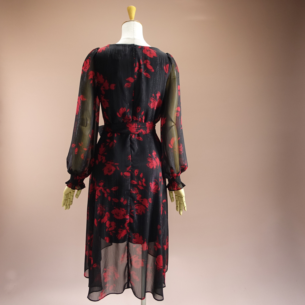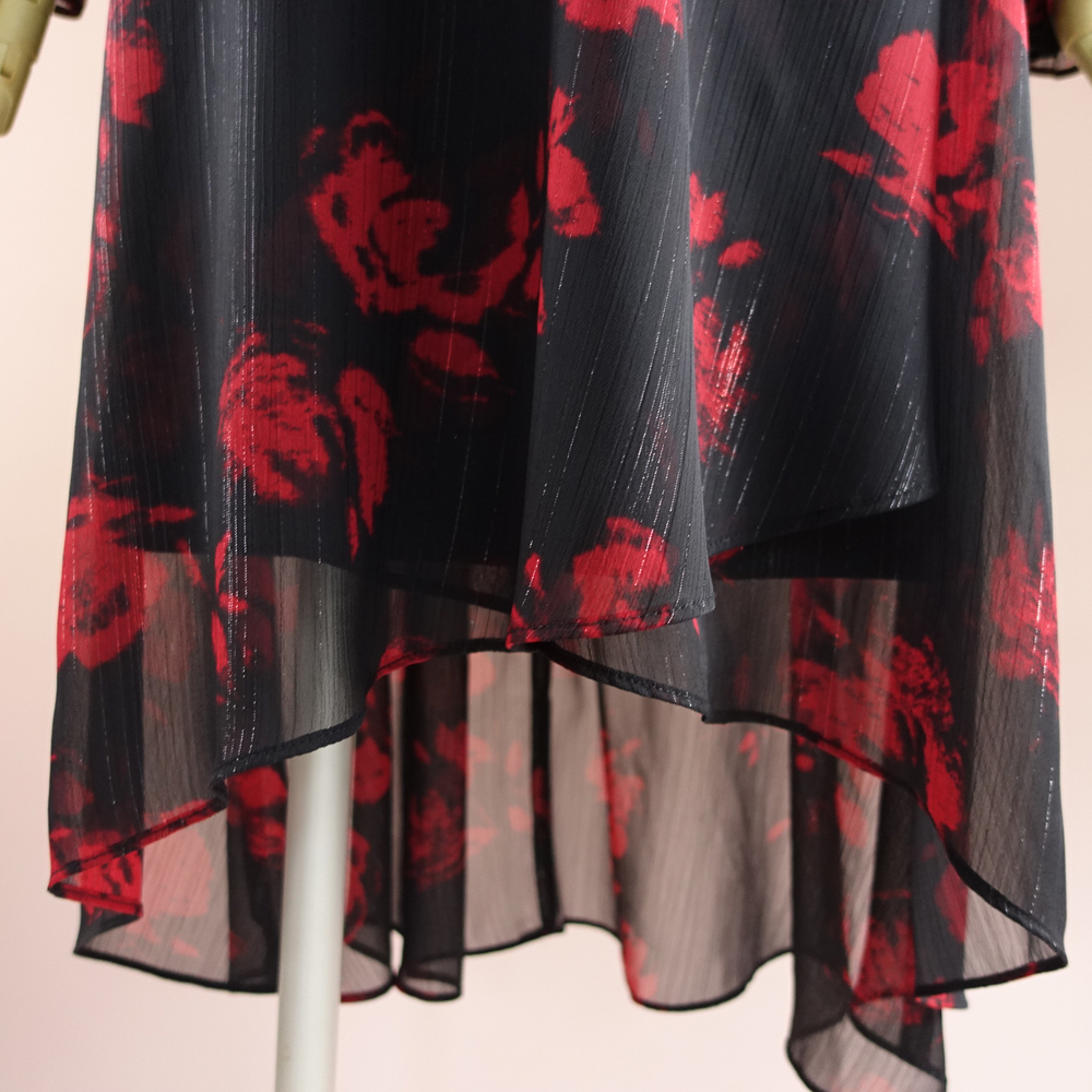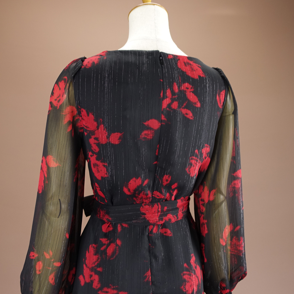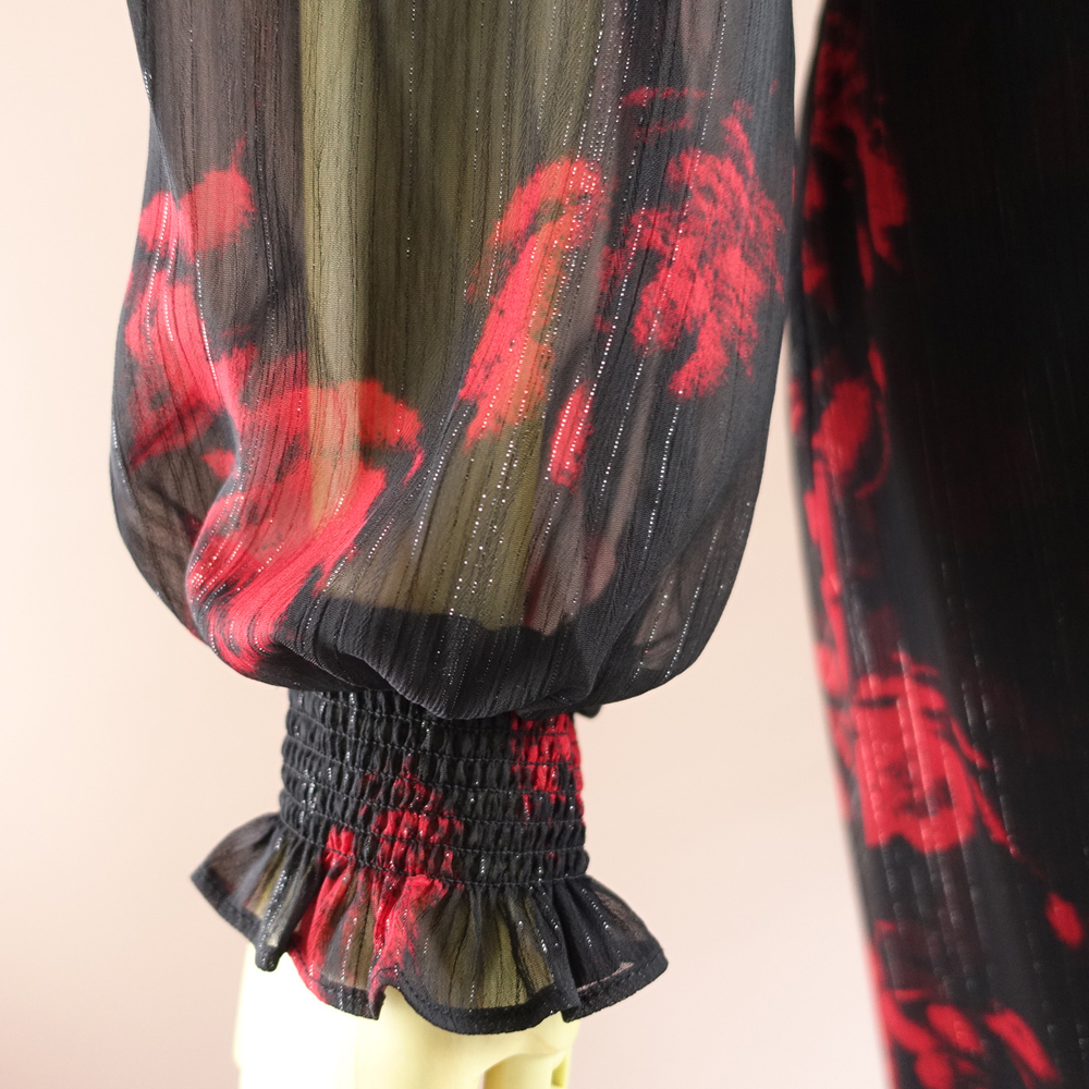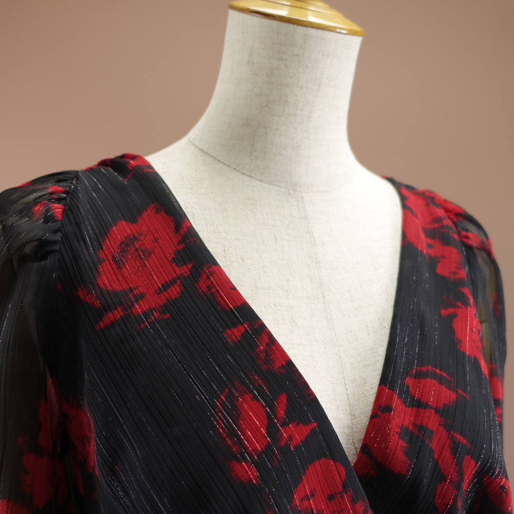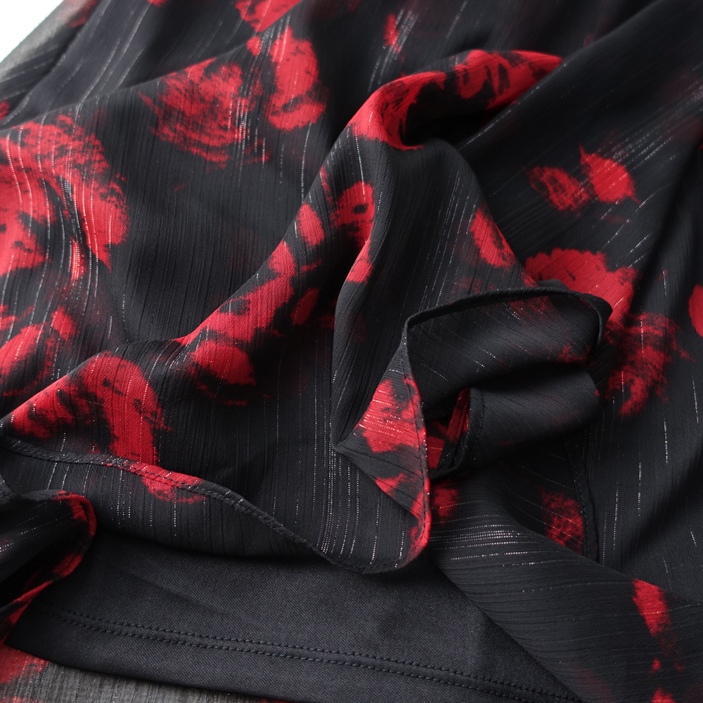 赤と黒のプリント柄にラメ糸が織り込まれた華やかなシフォン生地です