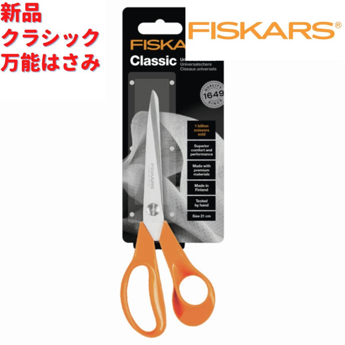 Fiskars Classic 21cmの万能ハサミは、右利きの方に最適なデザインで、家庭やオフィス、クラフト作業など幅広い用途に対応します。