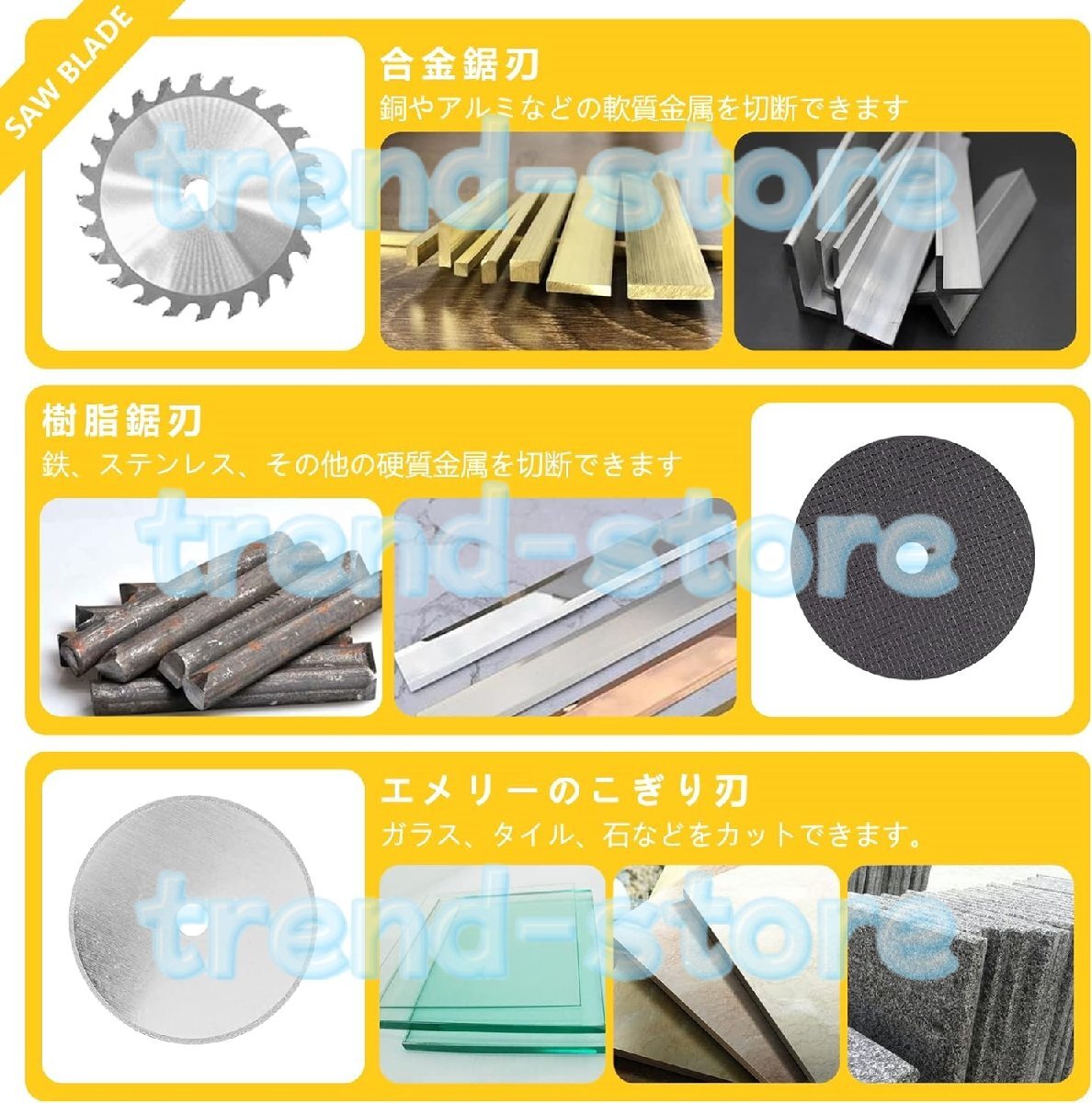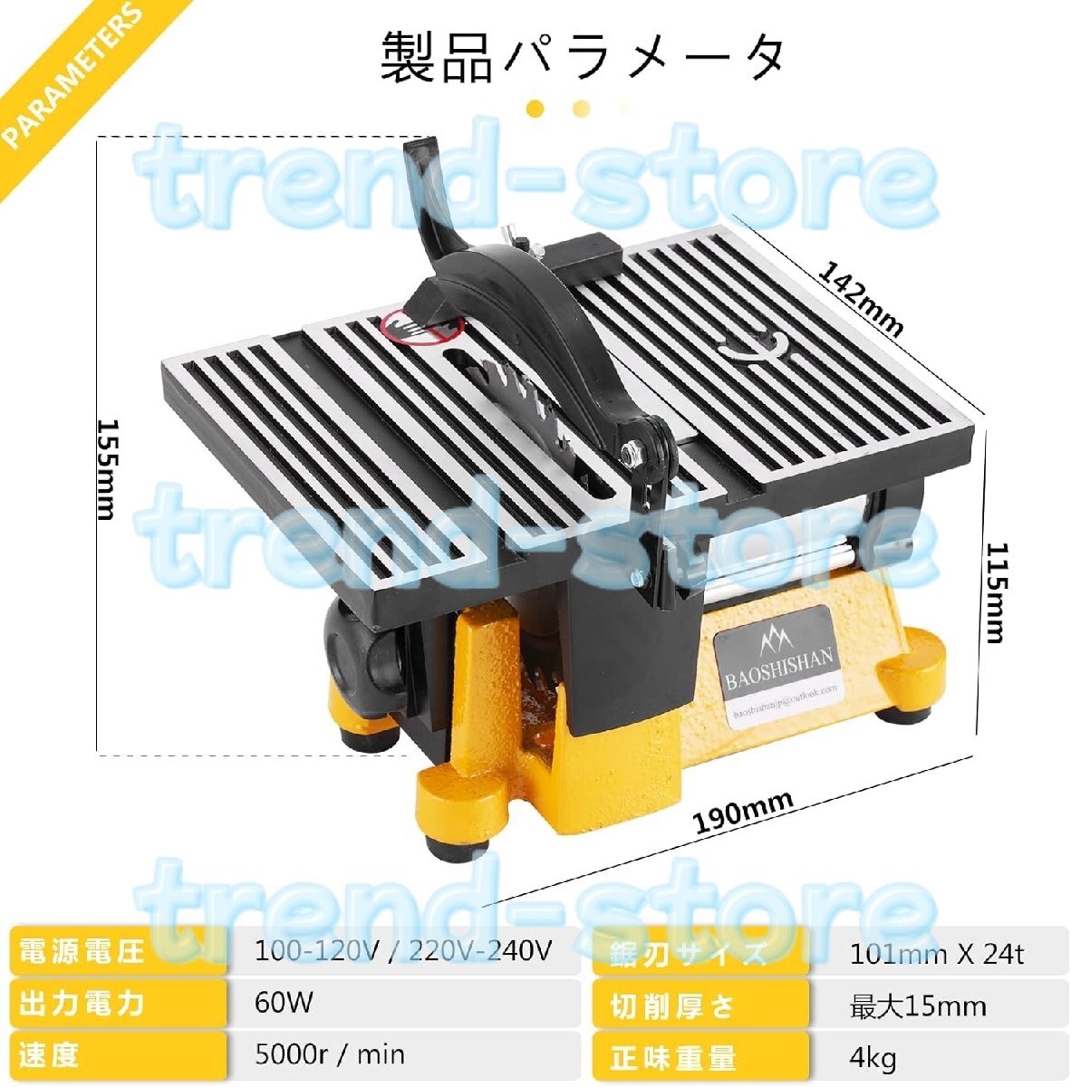 特徴:1. 軽量で持ち運びが簡単、2. 高効率カットによる低騒音モータ駆動、3. 2種類の材質鋸刃で、4.プラスチック、木材、ガラス、石、その他の非金属材料、銅、アルミニウム、その他の非鉄金属材料を切断することができます。仕様:名前: ミニテーブルソー出力電力: 60W速度: 5000r/分鋸刃サイズ/直径:100mm最大切断厚さ:15mm切込み深さ:15mmカラーボックスのサイズ: 200*200*155mm正味重量: 4kgパッケージ内容:1×ミニテーブルソー3x ブレード(合金鋸刃 X1、樹脂鋸刃 X1、エメリー鋸刃 X1)注記:1.手動測定のため、若干の誤差はご了承ください。2.ディスプレイや光の違いにより、写真では商品の実際の色が表示されない場合があります