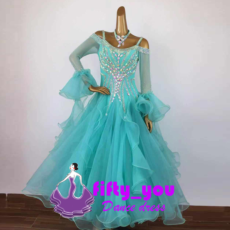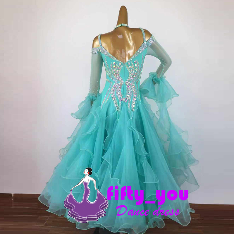 新品fifty_you セミオーダードレス  レディース社交ダンス衣装  高級品  競技発表用ダンスドレス  ライトストーン飾り  青緑色