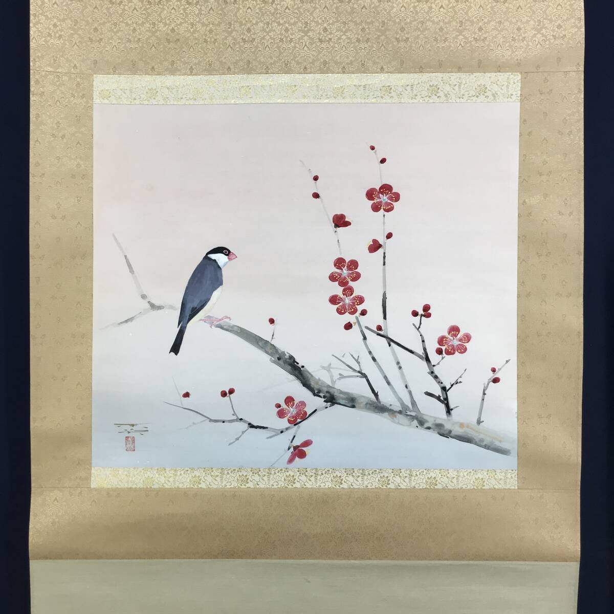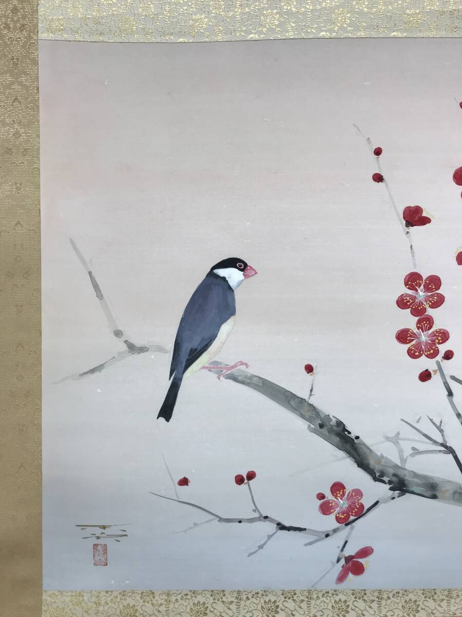 真作/林末次/日展/日本画/紅梅図/小禽図/花鳥図/横物/小鳥図/春の掛軸/掛軸☆宝船☆AI-688