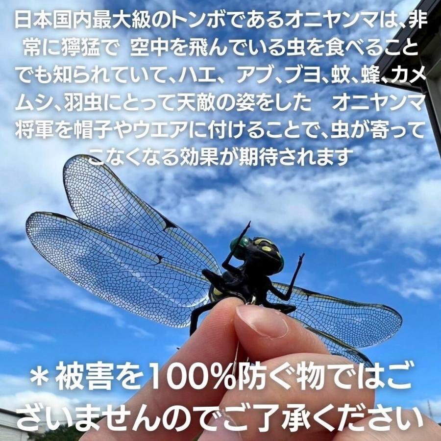 日本国内最大級のトンボであるオニヤンマは、非常に獰猛で 空中を飛んでいる虫を食べることでも知られていて、ハエ、 アブ、ブヨ、蚊、蜂、カメムシ、羽虫にとって天敵の姿をした オニヤンマ将軍を帽子やウエアに付けることで、虫が寄ってこなくなる効果が期待されます
