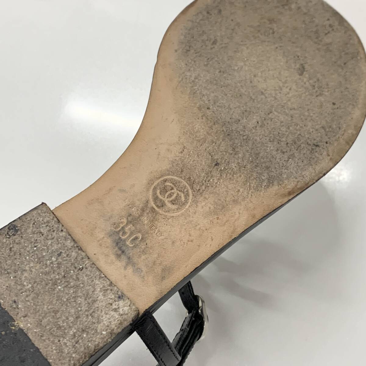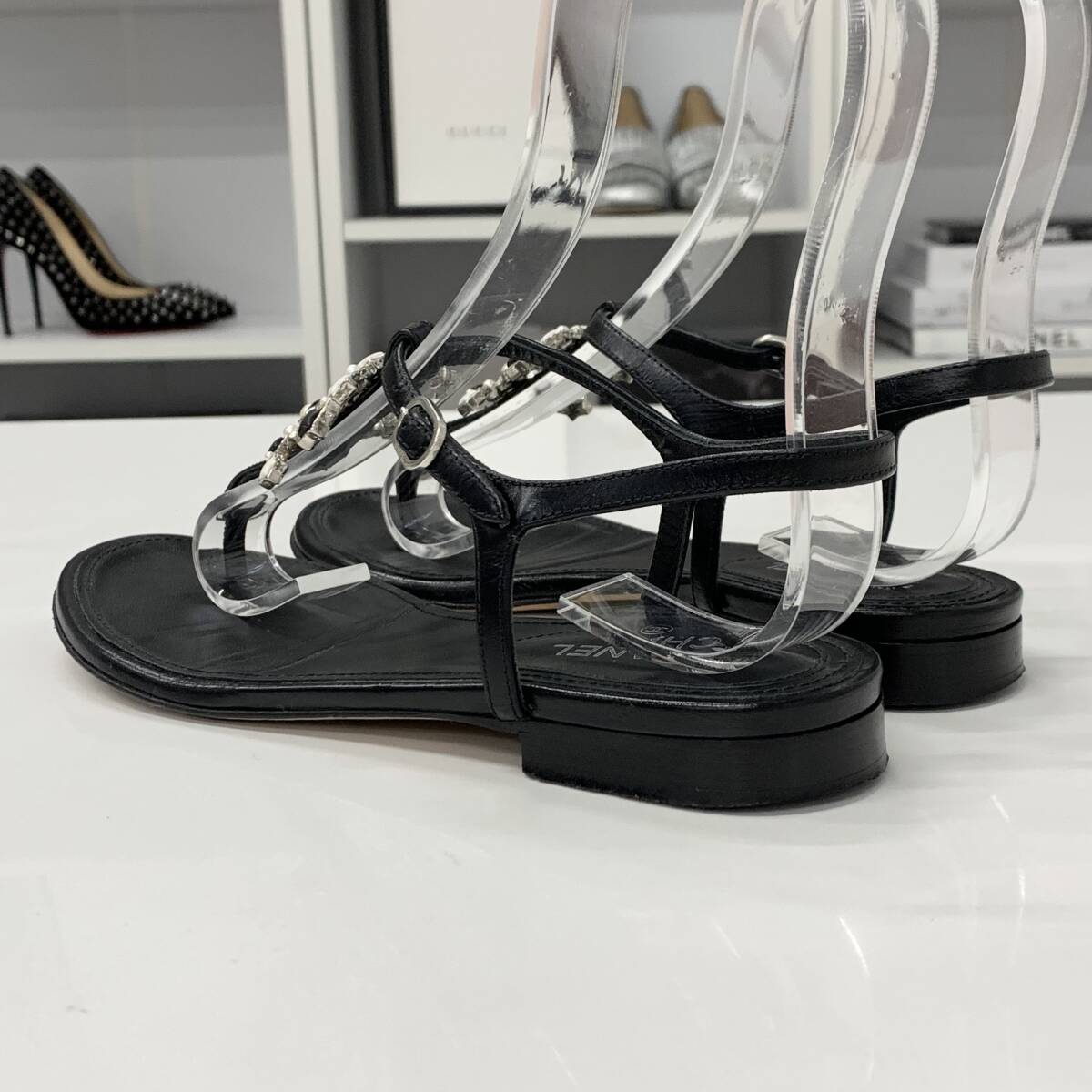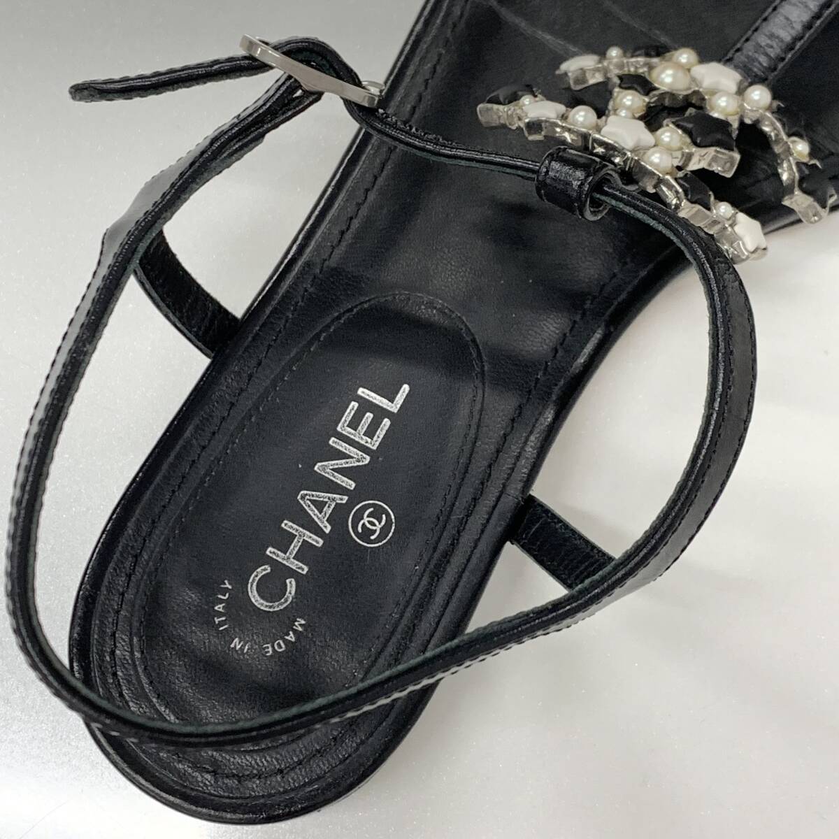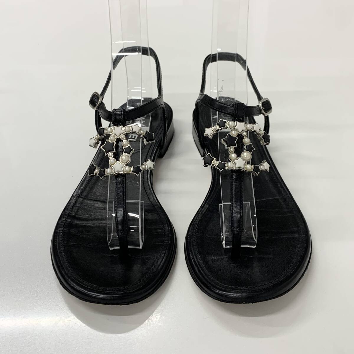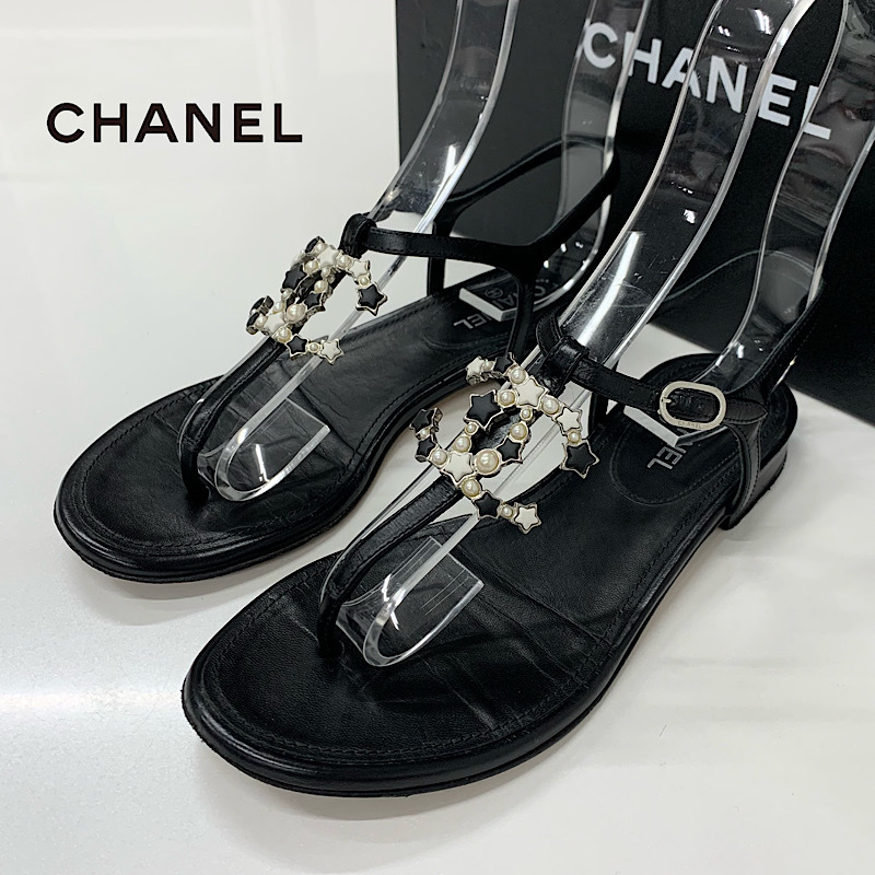 シャネル ココマーク レザー スター パール ストラップ トングサンダル ブラック